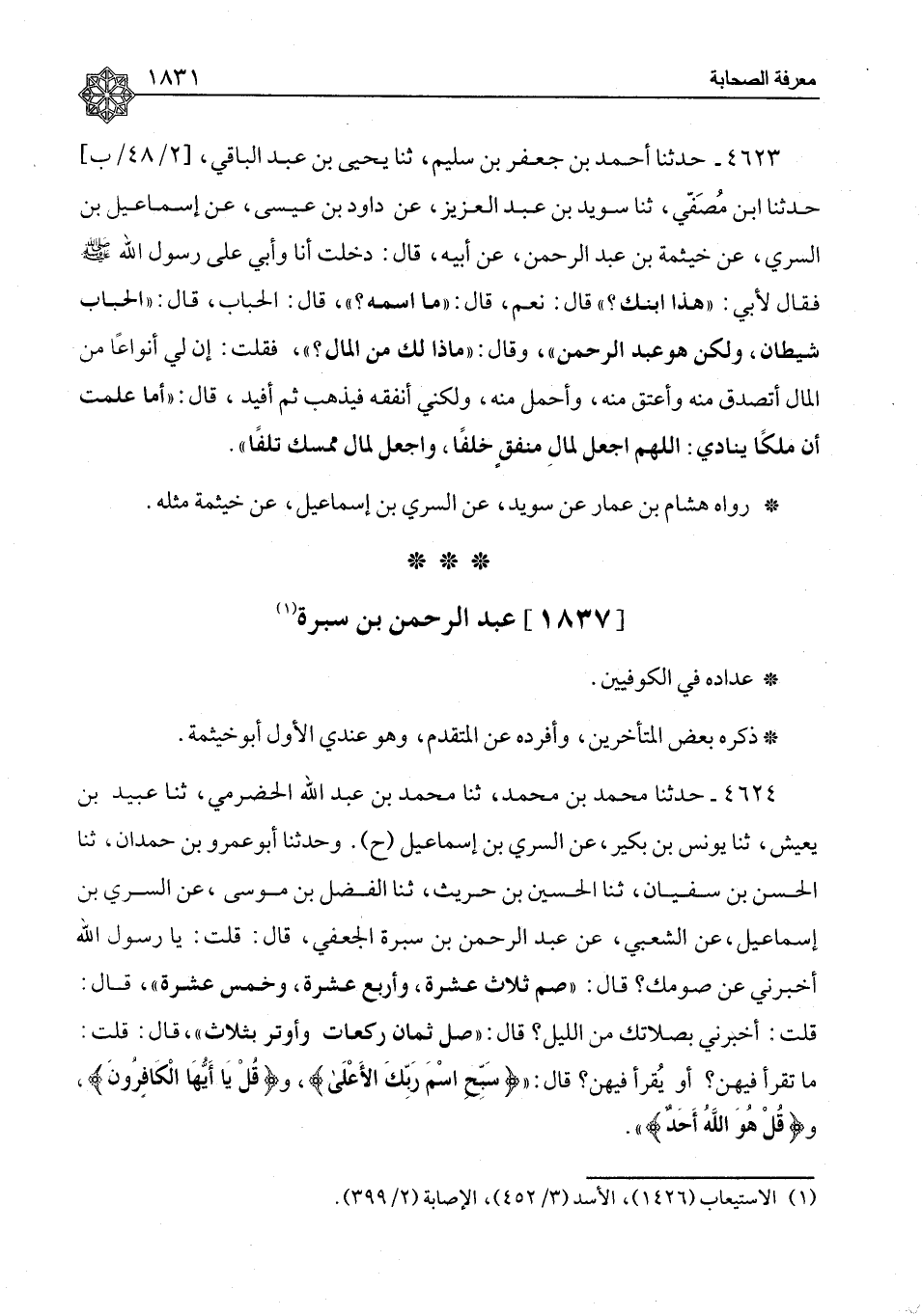 ٤٦٢٣ - حَدَّثَنَا أَحْمَدُ بْنُ جَعْفَرِ بْنِ سُلَيْمٍ، ثنا يَحْيَى بْنُ عَبْدِ الْبَاقِي، حَدَّثَنَا ابْنُ مُصَفَّى، ثنا سُوَيْدُ بْنُ عَبْدِ الْعَزِيزِ، عَنْ دَاوُدَ بْنِ عِيسَى، عَنْ إِسْمَاعِيلَ بْنِ السَّرِيِّ، عَنْ خَيْثَمَةَ بْنِ عَبْدِ الرَّحْمَنِ، عَنْ أَبِيهِ، قَالَ: " دَخَلْتُ أَنَا وَأَبِي، عَلَى رَسُولِ اللهِ صَلَّى اللَّهُ عَلَيْهِ وَسَلَّمَ، فَقَالَ لِأَبِي: «هَذَا ابْنُكَ؟» ، قَالَ: نَعَمْ، قَالَ: «مَا اسْمُهُ؟» ، قَالَ: الْحُبَابُ، قَالَ: «الْحُبَابُ شَيْطَانٌ، وَلَكِنْ هُوَ عَبْدُ الرَّحْمَنِ» ، وَقَالَ: «مَاذَا لَكَ مِنَ الْمَالِ؟» ، فَقُلْتُ: إِنَّ لِي أَنْوَاعًا مِنَ الْمَالِ أَتَصَدَّقُ مِنْهُ وَأُعْتِقُ مِنْهُ، وَأَحْمِلُ مِنْهُ، وَلَكِنِّي أُنْفِقُهُ، فَيَذْهَبُ، ثُمَّ أُفِيدُ، قَالَ: " أَعَلِمْتَ أَنَّ مَلَكًا يُنَادِي: اللهُمَّ، اجْعَلْ لِمَالِ مُنْفِقٍ خَلْفًا، وَاجْعَلْ لِمَالِ مُمْسِكٍ تَلَفًا " رَوَاهُ هِشَامُ بْنُ عَمَّارٍ، عَنْ سُوَيْدٍ، عَنِ السَّرِيِّ بْنِ إِسْمَاعِيلَ، عَنْ خَيْثَمَةَ مِثْلَهُ