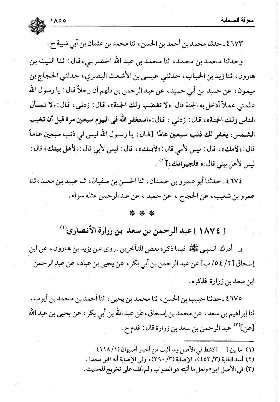 ٤٦٧٣ - حَدَّثَنَا مُحَمَّدُ بْنُ أَحْمَدَ بْنِ الْحَسَنِ، ثنا مُحَمَّدُ بْنُ عُثْمَانَ بْنِ أَبِي شَيْبَةَ، ح وَحَدَّثَنَا مُحَمَّدُ بْنُ مُحَمَّدٍ، ثنا مُحَمَّدُ بْنُ عَبْدِ اللهِ الْحَضْرَمِيُّ، قَالَ: ثنا اللَّيْثُ بْنُ هَارُونَ، ثنا زَيْدُ بْنُ الْحُبَابِ، حَدَّثَنِي عِيسَى بْنُ الْأَشْعَثِ الْبَصْرِيُّ، حَدَّثَنِي الْحَجَّاجُ بْنُ مَيْمُونٍ، عَنْ حُمَيْدِ بْنِ أَبِي حُمَيْدٍ، عَنْ عَبْدِ الرَّحْمَنِ بْنِ دَلْهَمٍ: أَنَّ رَجُلًا قَالَ: يَا رَسُولَ اللهِ، عَلِّمْنِي عَمَلًا أَدْخُلُ بِهِ الْجَنَّةَ، قَالَ: «لَا تَغْضَبْ وَلَكَ الْجَنَّةُ» ، قَالَ: زِدْنِي، قَالَ: «لَا تَسْأَلِ النَّاسَ وَلَكَ الْجَنَّةُ» ، قَالَ: زِدْنِي، قَالَ: «اسْتَغْفِرِ اللهَ فِي الْيَوْمِ سَبْعِينَ مَرَّةً قَبْلَ أَنْ تَغِيبَ الشَّمْسُ، يُغْفَرْ لَكَ ذَنْبُ سَبْعِينَ عَامًا» ، قَالَ: يَا رَسُولَ اللهِ، لَيْسَ لِي ذَنْبُ سَبْعِينَ عَامًا، قَالَ: «لِأُمِّكَ» ، قَالَ: لَيْسَ لِأُمِّي، قَالَ: «لِأَبِيكَ» ، قَالَ: لَيْسَ لِأَبِي، قَالَ: «لِأَهْلِ بَيْتِكَ» ، قَالَ: لَيْسَ لِأَهْلِ بَيْتِي، قَالَ: «فَلِجِيرَانِكَ»