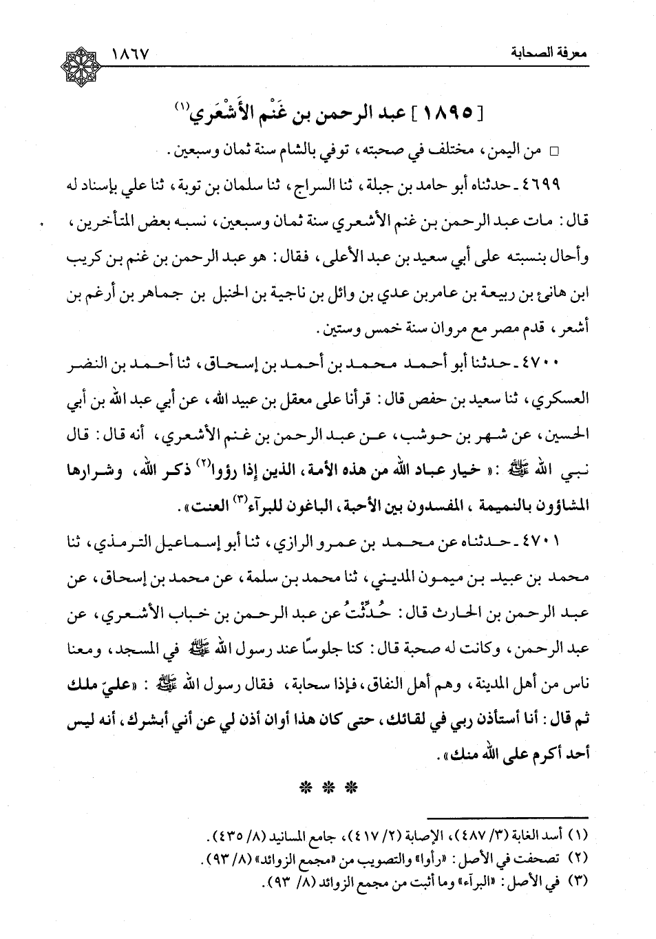 عَبْدُ الرَّحْمَنِ بْنُ غَنْمٍ الْأَشْعَرِيُّ مِنَ الْيَمَنِ، مُخْتَلَفٌ فِي صُحْبَتِهِ، تُوُفِّيَ بِالشَّامِ سَنَةَ ثَمَانٍ وَسَبْعِينَ