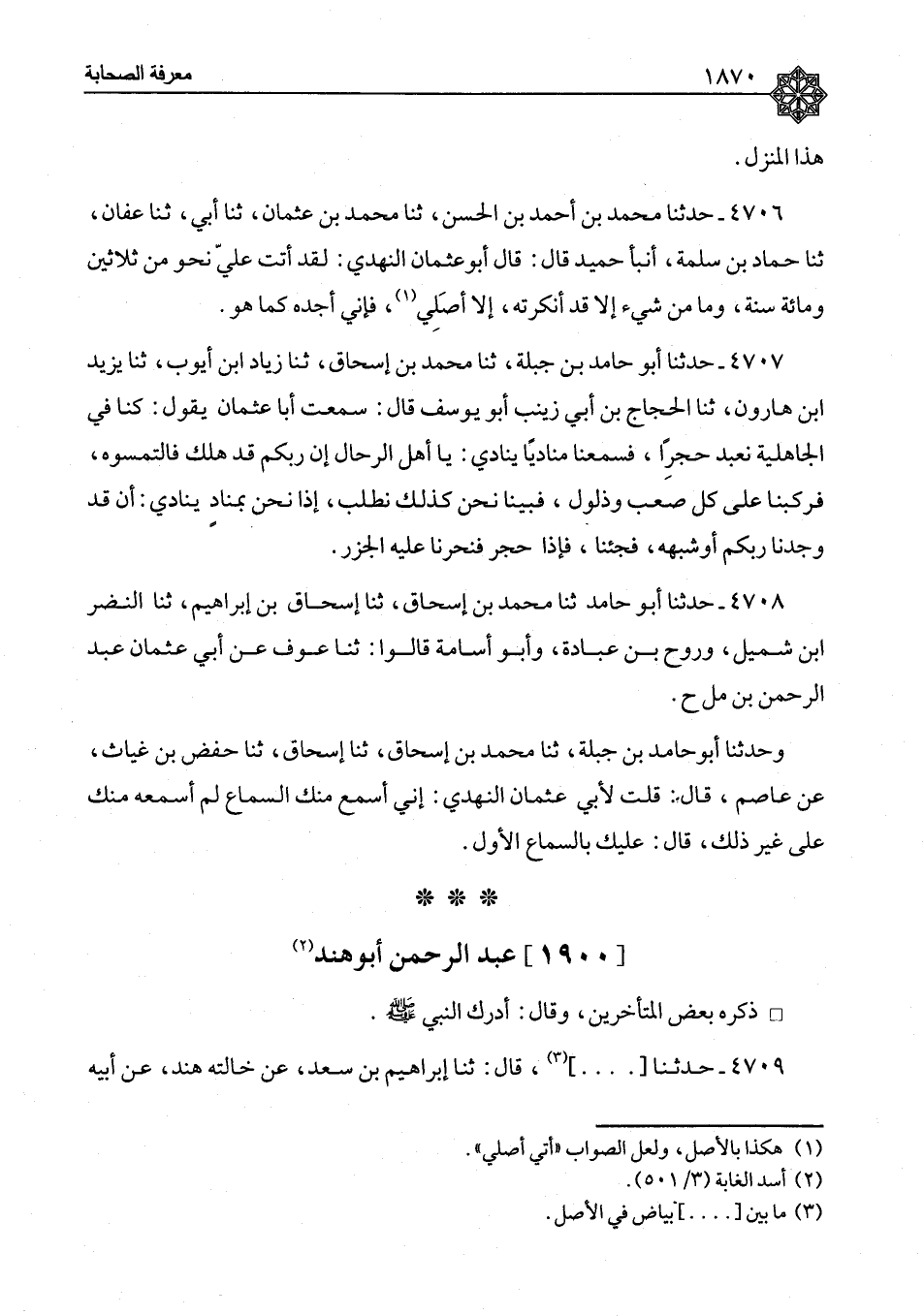 ٤٧٠٨ - حَدَّثَنَا أَبُو حَامِدٍ، ثنا مُحَمَّدُ بْنُ إِسْحَاقَ، ثنا إِسْحَاقُ بْنُ إِبْرَاهِيمَ، ثنا النَّضْرُ بْنُ شُمَيْلٍ، وَرَوْحُ بْنُ عُبَادَةَ، وَأَبُو أُسَامَةَ، قَالُوا: ثنا عَوْفٌ، عَنْ أَبِي عُثْمَانَ عَبْدِ الرَّحْمَنِ بْنِ مُلٍّ، ح وَحَدَّثَنَا أَبُو حَامِدِ بْنُ جَبَلَةَ، ثنا مُحَمَّدُ بْنُ إِسْحَاقَ، ثنا إِسْحَاقُ، ثنا حفضُ بْنُ غِيَاثٍ، عَنْ عَاصِمٍ، قَالَ: قُلْتُ لِأَبِي عُثْمَانَ النَّهْدِيِّ: إِنِّي أَسْمَعُ مِنْكَ السَّمَاعَ لَمْ أَسْمَعْهُ مِنْكَ عَلَى غَيْرِ ذَلِكَ، قَالَ: عَلَيْكَ بِالسَّمَاعِ الْأَوَّلِ