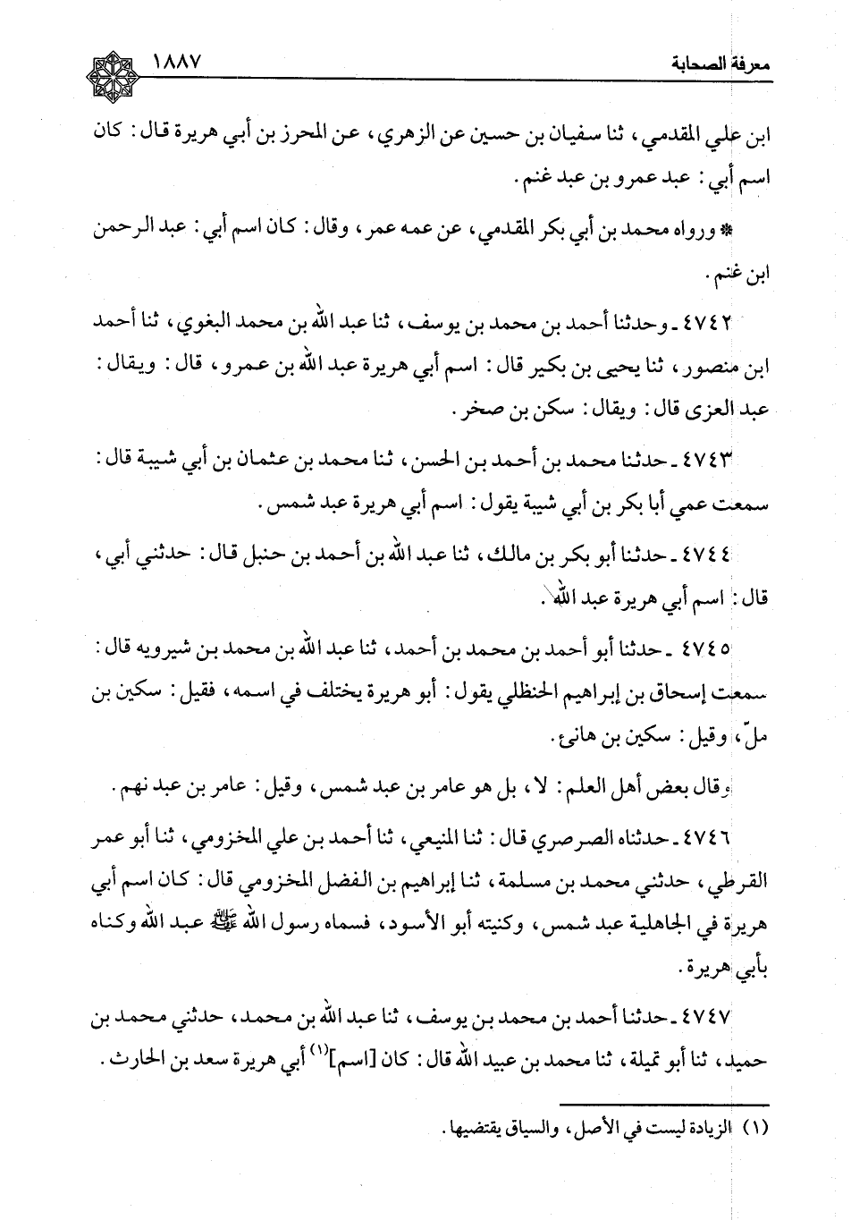 ٤٧٤٥ - حَدَّثَنَا أَبُو أَحْمَدَ بْنُ مُحَمَّدِ بْنِ أَحْمَدَ، ثنا عَبْدُ اللهِ بْنُ مُحَمَّدِ بْنِ شِيرَوَيْهِ، قَالَ: سَمِعْتُ إِسْحَاقَ بْنَ إِبْرَاهِيمَ الْحَنْظَلِيَّ يَقُولُ: أَبُو هُرَيْرَةَ يُخْتَلَفُ فِي اسْمِهِ، فَقِيلَ: سُكَيْنُ بْنُ مُلٍّ، وَقِيلَ: سُكَيْنُ بْنُ هَانِئٍ وَقَالَ بَعْضُ أَهْلِ الْعِلْمِ: لَا، بَلْ هُوَ عَامِرُ بْنُ عَبْدِ شَمْسِ، وَقِيلَ: عَامِرُ بْنُ عَبْدِ نَهِمٍ