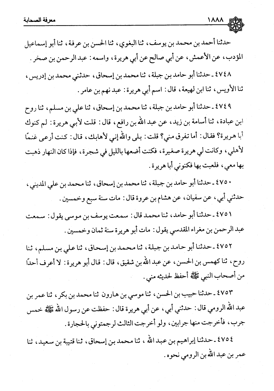 ٤٧٥٢ - حَدَّثَنَا أَبُو حَامِدِ بْنُ جَبَلَةَ، ثنا مُحَمَّدُ بْنُ إِسْحَاقَ، ثنا عَلِيُّ بْنُ مُسْلِمٍ، ثنا رَوْحٌ، ثنا كَهْمَسُ بْنُ الْحَسَنِ، عَن عَبْدِ اللهِ بْنِ شَقِيقٍ، قَالَ: قَالَ أَبُو هُرَيْرَةَ: «لَا أَعْرِفُ أَحَدًا مِنْ أَصْحَابِ النَّبِيِّ صَلَّى اللَّهُ عَلَيْهِ وَسَلَّمَ أَحْفَظَ لِحَدِيثِهِ مِنِّي»