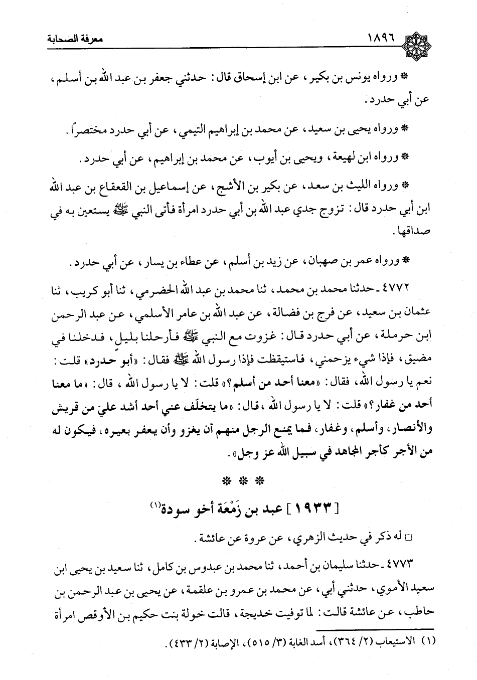 ٤٧٧٢ - حَدَّثَنَا مُحَمَّدُ بْنُ مُحَمَّدٍ، ثنا مُحَمَّدُ بْنُ عَبْدِ اللهِ الْحَضْرَمِيُّ، ثنا أَبُو كُرَيْبٍ، ثنا عُثْمَانُ بْنُ سَعِيدٍ، عَنْ فَرَّجَ بْنِ فَضَالَةَ، عَنْ عَبْدِ اللهِ بْنِ عَامِرِ الْأَسْلَمِيِّ، عَنْ عَبْدِ الرَّحْمَنِ بْنِ حَرْمَلَةَ، عَنْ أَبِي حَدْرَدٍ، قَالَ: غَزَوْتُ مَعَ النَّبِيِّ صَلَّى اللَّهُ عَلَيْهِ وَسَلَّمَ فَأَرْحَلْنَا بِلَيْلٍ، فَدَخَلْنَا فِي مَضِيقٍ، فَإِذَا شَيْءٌ يِزْحَمُنِي، فَاسْتَيْقَظْتُ فَإِذَا رَسُولُ اللهِ صَلَّى اللَّهُ عَلَيْهِ وَسَلَّمَ فَقَالَ: أبو حَدْرَدٍ قُلْتُ: نَعَمْ يَا رَسُولُ اللهِ، فَقَالَ: «مَعَنَا أَحَدٌ مِنْ أَسْلَمَ؟» قُلْتُ: لَا يَا رَسُولُ اللهِ، قَالَ: «مَا مَعَنَا أَحَدٌ مِنْ غِفَارَ؟» قُلْتُ: لَا يَا رَسُولَ اللهِ، قَالَ: «مَا يَتَخَلَّفُ عَنِّي أَحَدٌ أَشَدُّ عَلَيَّ مِنْ قُرَيْشٍ وَالْأَنْصَارِ، وَأَسْلَمَ، وَغِفَارَ، فَمَا يَمْنَعُ الرَّجُلَ مِنْهُمْ أَنْ يَغْزُوَ وَأَنْ يُعَفِّرَ بَعِيرَهُ، فَيَكُونُ لَهُ مِنَ الْأَجْرِ كَأَجْرِ الْمُجَاهِدِ فِي سَبِيلِ اللهِ عَزَّ وَجَلَّ»
