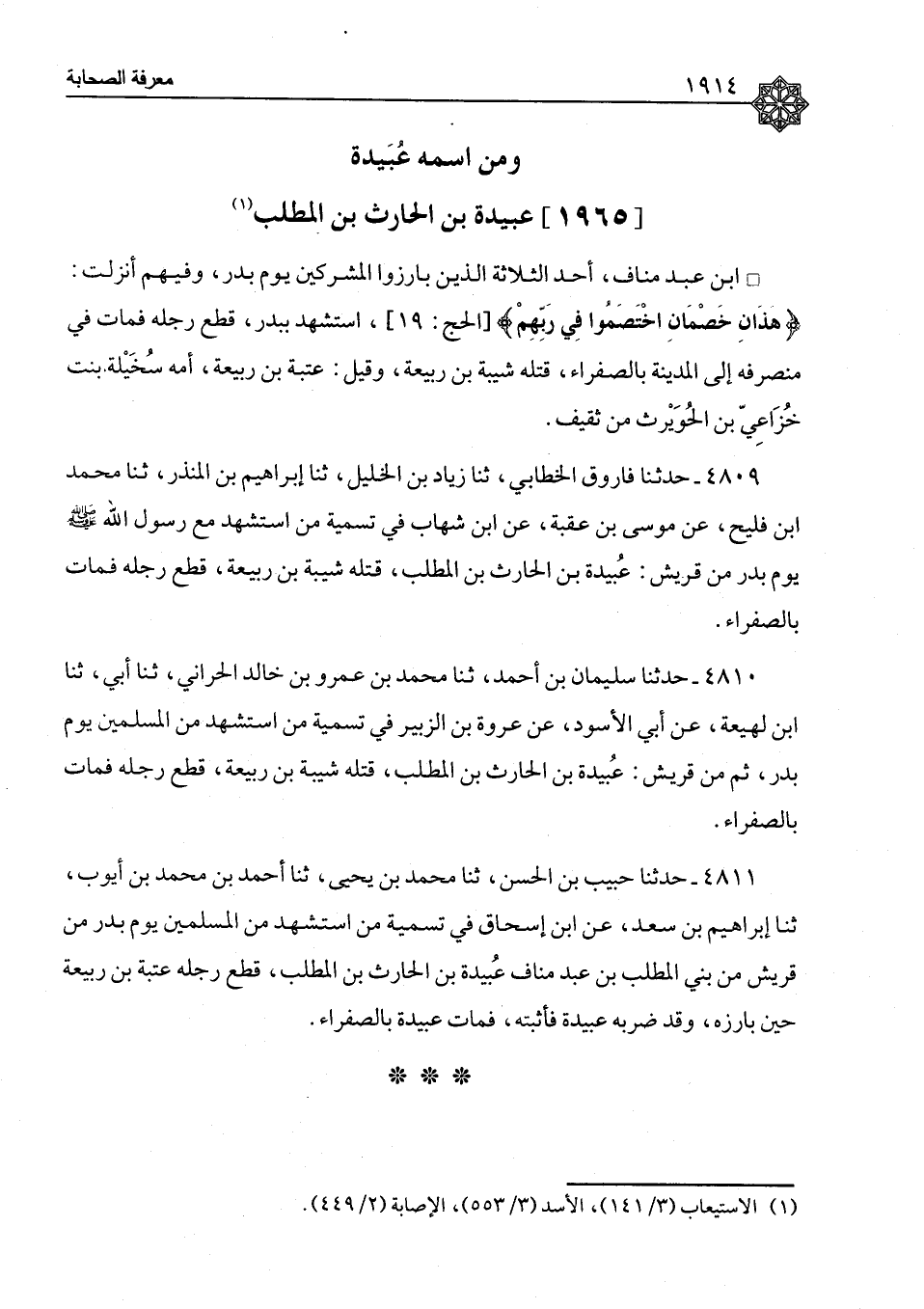٤٨٠٩ - حَدَّثَنَا فَارُوقٌ الْخَطَّابِيُّ، ثنا زِيَادُ بْنُ الْخَلِيلِ، ثنا إِبْرَاهِيمُ بْنُ الْمُنْذِرِ، ثنا مُحَمَّدُ بْنُ فُلَيْحٍ، عَنْ مُوسَى بْنِ عُقْبَةَ، عَنِ ابْنِ شِهَابٍ، فِي تَسْمِيَةِ مَنِ اسْتُشْهِدَ مَعَ رَسُولِ اللهِ صَلَّى اللَّهُ عَلَيْهِ وَسَلَّمَ يَوْمَ بَدْرٍ مِنْ قُرَيْشٍ: عُبَيْدَةُ بْنُ الْحَارِثِ بْنِ الْمُطَّلِبِ، قَتَلَهُ شَيْبَةُ بْنُ رَبِيعَةَ، قَطَعَ رِجْلَهُ فَمَاتَ بِالصَّفْرَاءِ