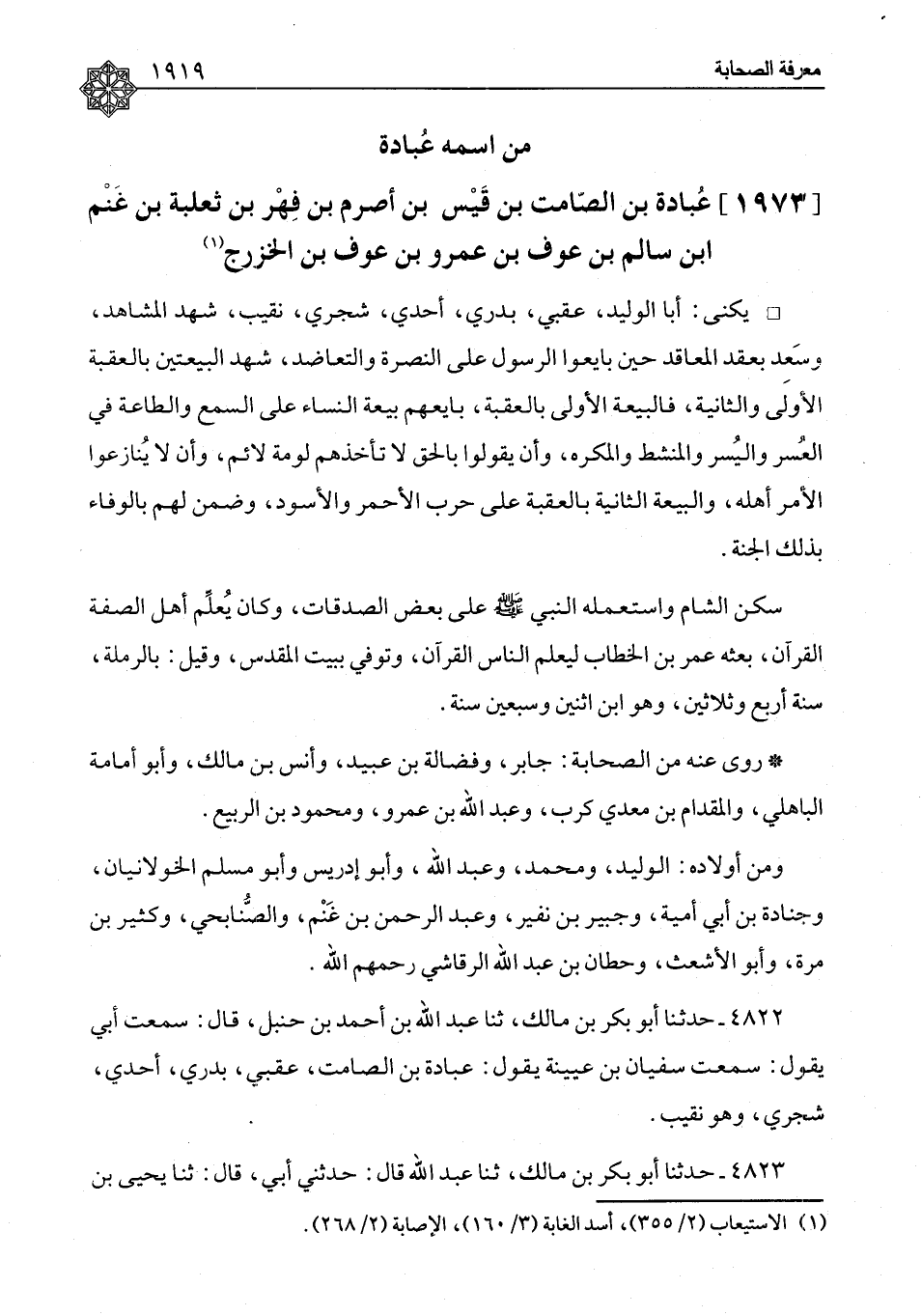 عُبَادَةُ بْنُ الصَّامِتِ بْنِ قَيْسِ بْنِ أَصْرَمِ بْنِ فِهْرِ بْنِ ثَعْلَبَةَ بْنِ غَنْمِ بْنِ سَالِمِ بْنِ عَوْفِ بْنِ عَمْرِو بْنِ عَوْفِ بْنِ الْخَزْرَجِ يُكْنَى: أَبَا الْوَلِيدِ، عَقَبِيٌّ، بَدْرِيٌّ، أُحُدِيٌّ، شَجَرِيٌّ، نَقِيبٌ، شَهِدَ الْمَشَاهِدَ، وَسَعِدَ بِعَقْدِ الْمَعَاقِدِ حِينَ بَايَعُوا الرَّسُولَ عَلَى النُّصْرَةِ والتَّعَاضُدَ، شَهِدَ الْبَيْعَتَيْنِ بِالْعَقَبَةِ الْأُولَى وَالثَّانِيَةِ، فَالْبَيْعَةُ الْأُولَى بِالْعَقَبَةِ، بَايَعَهُمْ بَيْعَةَ النِّسَاءِ إِلَى السَّمْعِ وَالطَّاعَةِ فِي الْعُسْرِ وَالْيُسْرِ وَالْمَنْشَطِ وَالْمَكْرَهِ، وَأَنْ يَقُولُوا بِالْحَقِّ لَا تَأْخُذُهُمْ لَوْمَةُ لَائِمٍ، وَأَنْ لَا يُنَازِعُوا الْأَمْرَ أَهْلَهُ، وَالْبَيْعَةُ الثَّانِيَةُ بِالْعَقَبَةِ عَلَى حَرْبِ الْأَحْمَرِ وَالْأَسْوَدِ، وَضَمِنَ لَهُمْ بِالْوَفَاءِ بِذَلِكَ الْجَنَّةَ سَكَنَ الشَّامَ وَاسْتَعْمَلَهُ النَّبِيُّ صَلَّى اللَّهُ عَلَيْهِ وَسَلَّمَ عَلَى بَعْضِ الصَّدَقَاتِ، وَكَانَ يُعَلِّمُ أَهْلَ الصُّفَّةِ الْقُرْآنَ، بَعَثَهُ عُمَرُ بْنُ الْخَطَّابِ لِيُعَلِّمَ النَّاسَ الْقُرْآنَ، وَتُوُفِّيَ بِبَيْتِ الْمَقْدِسِ، وَقِيلَ: بِالرَّمْلَةِ، سَنَةَ أَرْبَعٍ وَثَلَاثِينَ، وَهُوَ ابْنُ اثْنَيْنِ وَسَبْعِينَ سَنَةً رَوَى عَنْهُ مِنَ الصَّحَابَةِ: جَابِرٌ، وَفَضَالَةُ بْنُ عُبَيْدٍ، وَأَنَسُ بْنُ مَالِكٍ، وَأَبُو أُمَامَةَ الْبَاهِلِيُّ، وَالْمِقْدَامُ بْنُ مَعْدِي كَرِبَ، وَعَبْدُ اللهِ بْنُ عَمْرٍو، وَمَحْمُودُ بْنُ الرَّبِيعِ وَمَنْ أَوْلَادِهِ: الْوَلِيدُ، وَمُحَمَّدٌ، وَعَبْدُ اللهِ، وَأَبُو إِدْرِيسَ، وَأَبُو مُسْلِمٍ الْخَوْلَانْيَانُ، وَجُنَادَةُ بْنُ أَبِي أُمَيَّةَ، وَجُبَيْرُ بْنُ نُفَيْرٍ، وَعَبْدُ الرَّحْمَنِ بْنُ غَنْمٍ، وَالصُّنَابِحِيُّ، وَكَثِيرُ بْنُ مُرَّةَ، وَأَبُو الْأَشْعَثِ، وَحَطَّانُ بْنُ عَبْدِ اللهِ الرَّقَاشِيُّ رَحِمَهُمُ اللهُ