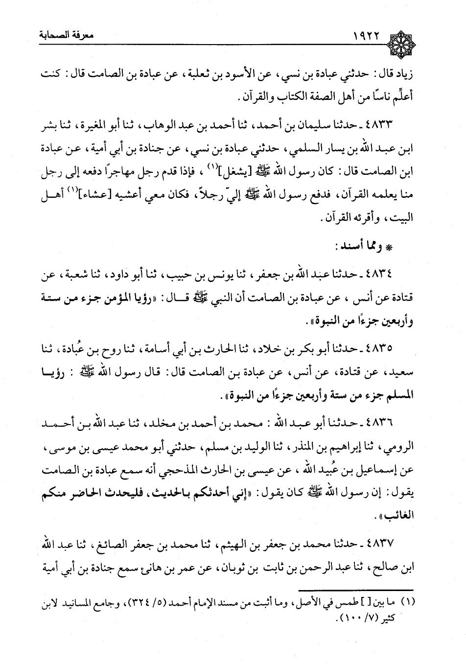 ٤٨٣٥ - حَدَّثَنَا أَبُو بَكْرِ بْنُ خَلَّادٍ، ثنا الْحَارِثُ بْنُ أَبِي أُسَامَةَ، ثنا رَوْحُ بْنُ عُبَادَةَ، ثنا سَعِيدٌ، عَنْ قَتَادَةَ، عَنْ أَنَسٍ، عَنْ عُبَادَةَ بْنِ الصَّامِتِ، قَالَ: قَالَ رَسُولُ اللهِ صَلَّى اللَّهُ عَلَيْهِ وَسَلَّمَ: «رُؤْيَا الْمُسْلِمِ جُزْءٌ مِنْ سِتَّةٍ وَأَرْبَعِينَ جُزْءًا مِنَ النُّبُوَّةِ»