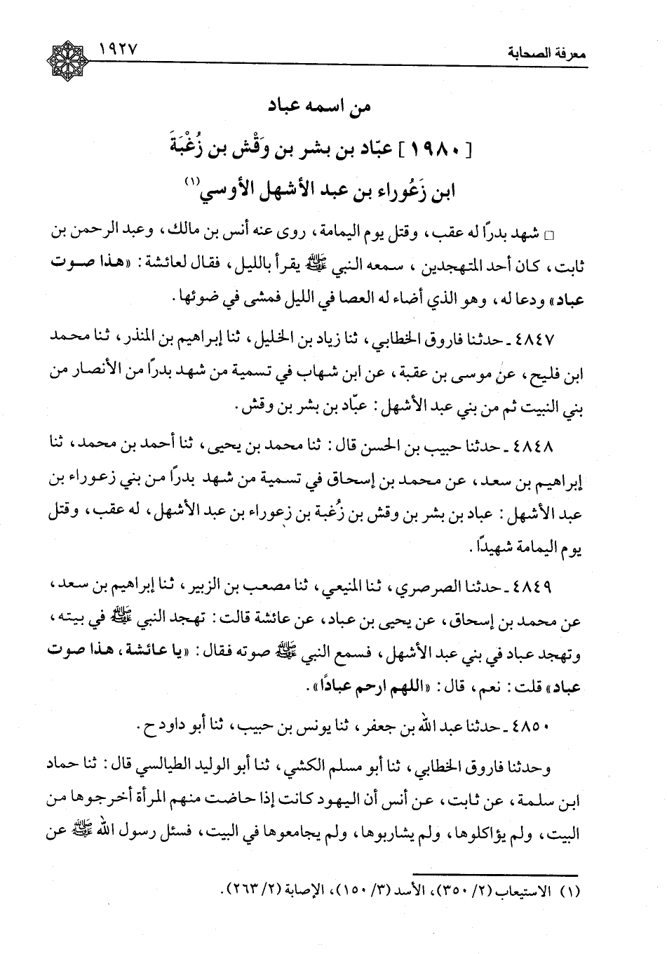 ٤٨٤٨ - حَدَّثَنَا حَبِيبُ بْنُ الْحَسَنِ، قَالَ: ثنا مُحَمَّدُ بْنُ يَحْيَى، ثنا أَحْمَدُ بْنُ مُحَمَّدٍ، ثنا إِبْرَاهِيمُ بْنُ سَعْدٍ، عَنْ مُحَمَّدِ بْنِ إِسْحَاقَ، " فِي تَسْمِيَةِ مَنْ شَهِدَ بَدْرًا مِنْ بَنِي زَعُورَاءَ بْنِ عَبْدِ الْأَشْهَلِ: عَبَّادُ بْنُ بِشْرِ بْنِ وَقْشِ بْنِ زُغْبَةَ بْنِ زَعُورَاءَ بْنِ عَبْدِ الْأَشْهَلِ، لَهُ عَقِبٌ، وَقُتِلَ يَوْمَ الْيَمَامَةِ شَهِيدًا "