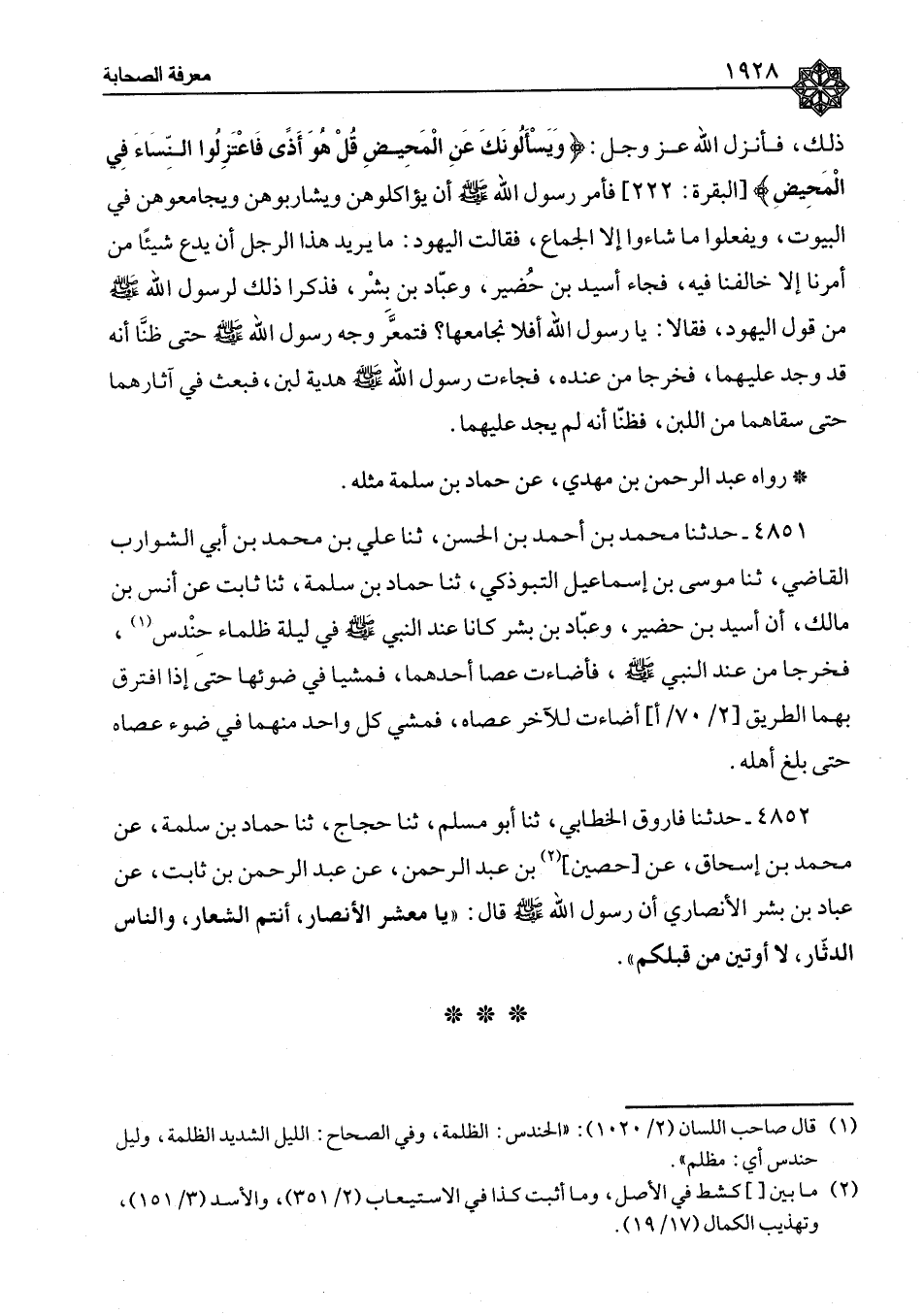 ٤٨٥١ - حَدَّثَنَا مُحَمَّدُ بْنُ أَحْمَدَ بْنِ الْحَسَنِ، ثنا عَلِيُّ بْنُ مُحَمَّدِ بْنِ أَبِي الشَّوَارِبِ الْقَاضِي، ثنا مُوسَى بْنُ إِسْمَاعِيلَ التَّبُوذَكِيُّ، ثنا حَمَّادُ بْنُ سَلَمَةَ، ثنا ثَابِتٌ، عَنْ أَنَسِ بْنِ مَالِكٍ، «أَنَّ أُسَيْدَ بْنَ حُضَيْرٍ، وَعَبَّادَ بْنَ بِشْرٍ، كَانَا عِنْدَ النَّبِيِّ صَلَّى اللَّهُ عَلَيْهِ وَسَلَّمَ فِي لَيْلَةٍ ظَلْمَاءَ حِنْدِسٍ، فَخَرَجَا مِنْ عِنْدِ النَّبِيِّ صَلَّى اللَّهُ عَلَيْهِ وَسَلَّمَ فَأَضَاءَتْ عَصَا أَحَدِهِمَا، فَمَشَيَا فِي ضَوْئِهَا حَتَّى إِذَا افْتَرَقَ بِهِمَا الطَّرِيقُ أَضَاءَتْ لِلْآخَرِ عَصَاهُ، فَمَشَى كُلُّ وَاحِدٍ مِنْهُمَا فِي ضَوْءِ عَصَاهُ حَتَّى بَلَغَ أَهْلَهُ»
