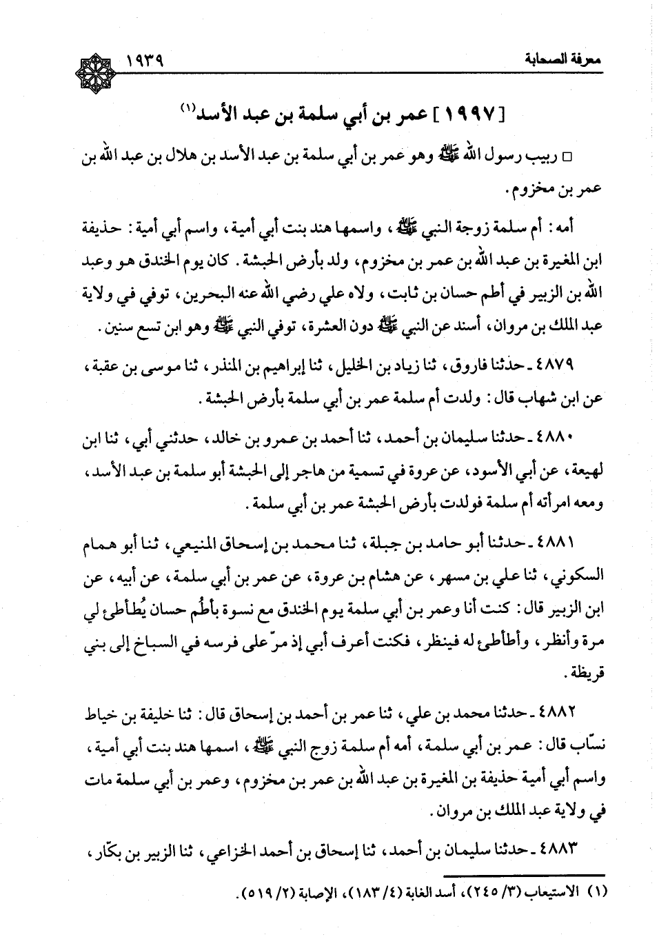 ٤٨٨٣ - حَدَّثَنَا سُلَيْمَانُ بْنُ أَحْمَدَ، ثنا إِسْحَاقُ بْنُ أَحْمَدَ الْخُزَاعِيُّ، ثنا الزُّبَيْرُ بْنُ بَكَّارٍ، ⦗١٩٤٠⦘ قَالَ: «وُلِدَ عُمَرُ بْنُ أَبِي سَلَمَةَ بِأَرْضِ الْحَبَشَةِ، وَكَانَ مَعَ عَلِيِّ بْنِ أَبِي طَالِبٍ فَوَلَّاهُ الْبَحْرَيْنِ»