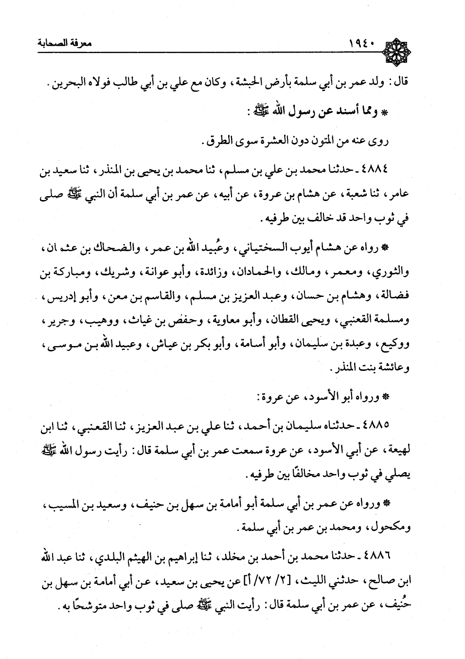 ٤٨٨٤ - وَمِمَّا أَسْنَدَ عَنْ رَسُولِ اللهِ صَلَّى اللَّهُ عَلَيْهِ وَسَلَّمَ: رَوَى عَنْهُ، مِنَ الْمُتُونِ دُونَ الْعَشَرَةِ سِوَى الطُّرُقِ حَدَّثَنَا مُحَمَّدُ بْنُ عَلِيِّ بْنِ مُسْلِمٍ، ثنا مُحَمَّدُ بْنُ يَحْيَى بْنِ الْمُنْذِرِ، ثنا سَعِيدُ بْنُ عَامِرٍ، ثنا شُعْبَةُ، عَنْ هِشَامِ بْنِ عُرْوَةَ، عَنْ أَبِيهِ، عَنْ عُمَرَ بْنِ أَبِي سَلَمَةَ، «أَنَّ النَّبِيَّ صَلَّى اللَّهُ عَلَيْهِ وَسَلَّمَ صَلَّى فِي ثَوْبٍ وَاحِدٍ قَدْ خَالَفَ بَيْنَ طَرَفَيْهِ» رَوَاهُ عَنْ هِشَامٍ أَيُّوبُ السَّخْتِيَانِيُّ، وَعُبَيْدُ اللهِ بْنُ عُمَرَ، وَالضَّحَّاكُ بْنُ عُثْمَانَ وَالثَّوْرِيُّ، وَمَعْمَرٌ، وَمَالِكٌ، وَالْحَمَّادَانِ، وَزَائِدَةُ، وَأَبُو عَوَانَةَ، وَشَرِيكٌ، وَمُبَارَكُ بْنُ فَضَالَةَ، وَهِشَامُ بْنُ حَسَّانَ، وَعَبْدُ الْعَزِيزِ بْنُ مُسْلِمٍ، وَالْقَاسِمُ بْنُ مَعْنٍ، وَأَبُو إِدْرِيسَ، وَمَسْلَمَةُ الْقَعْنَبِيُّ، وَيَحْيَى الْقَطَّانُ، وَأَبُو مُعَاوِيَةَ، وَحَفْصُ بْنُ غِيَاثٍ، وَوُهَيْبٌ، وَجَرِيرٌ، وَوَكِيعٌ، وَعَبْدَةُ بْنُ سُلَيْمَانَ، وَأَبُو أُسَامَةَ، وَأَبُو بَكْرِ بْنُ عَيَّاشٍ، وَعُبَيْدُ اللهِ بْنُ مُوسَى، وَعَائِشَةُ بِنْتُ الْمُنْذِرِ وَرَوَاهُ أَبُو الْأَسْوَدِ، عَنْ عُرْوَةَ