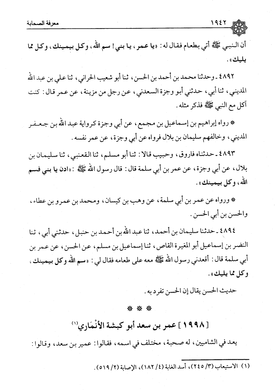 ٤٨٩٤ - حَدَّثَنَا سُلَيْمَانُ بْنُ أَحْمَدَ، ثنا عَبْدُ اللهِ بْنُ أَحْمَدَ بْنِ حَنْبَلٍ، حَدَّثَنِي أَبِي، ثنا النَّضْرُ بْنُ إِسْمَاعِيلَ أَبُو الْمُغِيرَةِ الْقَاصُّ، ثنا إِسْمَاعِيلُ بْنُ مُسْلِمٍ، عَنِ الْحَسَنِ، عَنْ عُمَرَ بْنِ أَبِي سَلَمَةَ، قَالَ: أَقْعَدَنِي رَسُولُ اللهِ صَلَّى اللَّهُ عَلَيْهِ وَسَلَّمَ مَعَهُ عَلَى طَعَامِهِ فَقَالَ لِي: «سَمِّ اللهَ، وَكُلْ بِيَمِينِكَ، وَكُلْ مِمَّا يَلِيكَ» حَدِيثُ الْحَسَنِ يُقَالُ إِنَّ الْحَسَنَ تَفَرَّدَ بِهِ