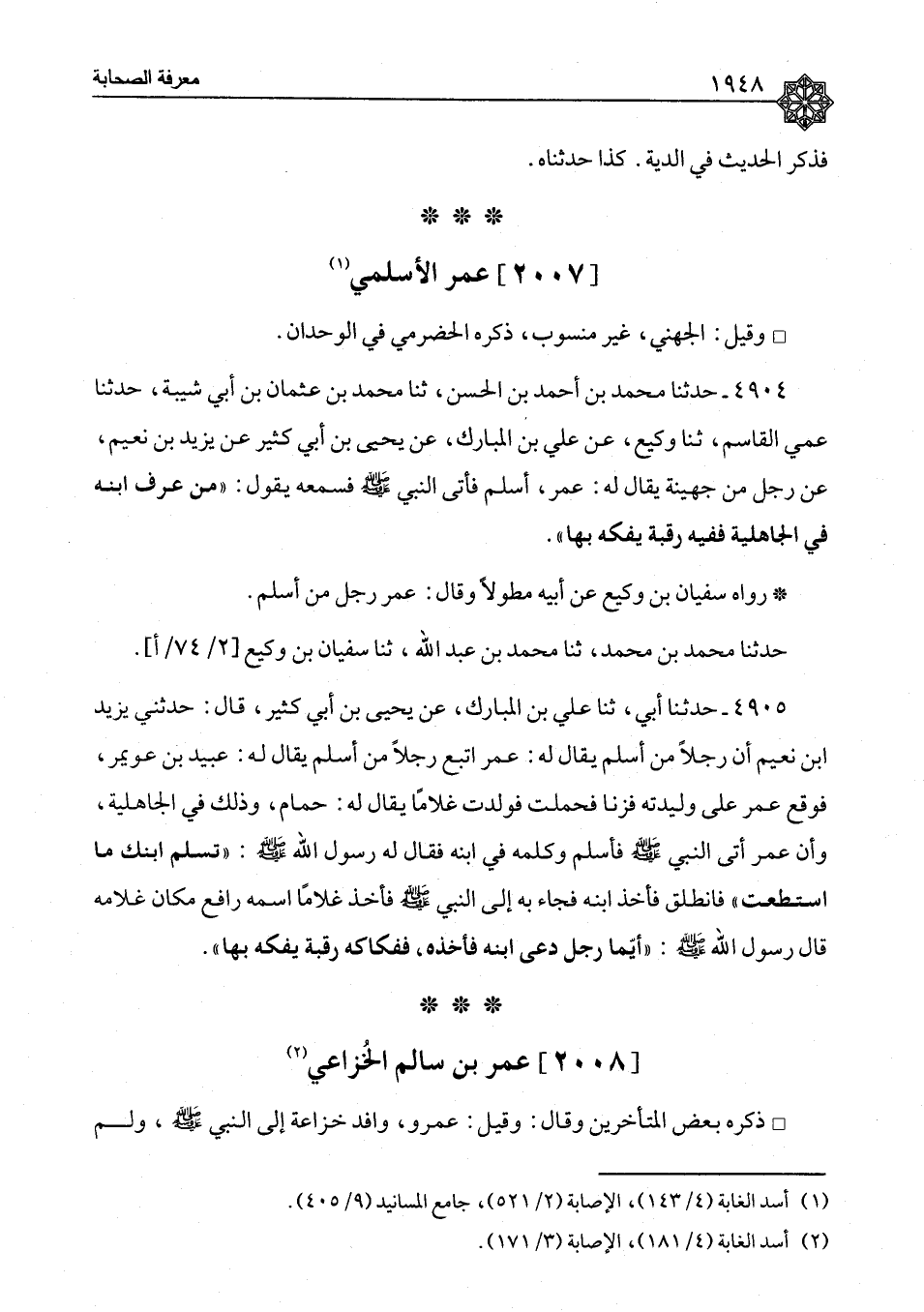 ٤٩٠٤ - حَدَّثَنَا مُحَمَّدُ بْنُ أَحْمَدَ بْنِ الْحَسَنِ، ثنا مُحَمَّدُ بْنُ عُثْمَانَ بْنِ أَبِي شَيْبَةَ، حَدَّثَنَا عَمِّي الْقَاسِمُ، ثنا وَكِيعٌ، عَنْ عَلِيِّ بْنِ الْمُبَارَكِ، عَنْ يَحْيَى بْنِ أَبِي كَثِيرٍ، عَنْ يَزِيدَ بْنِ نُعَيْمٍ، عَنْ رَجُلٍ مِنْ جُهَيْنَةَ يُقَالُ لَهُ عُمَرُ أَسْلَمَ فَأَتَى النَّبِيَّ صَلَّى اللَّهُ عَلَيْهِ وَسَلَّمَ فَسَمِعَهُ يَقُولُ: «مَنْ عَرَفَ ابْنَهُ فِي الْجَاهِلِيَّةِ فَفِيهِ رَقَبَةٌ يَفُكُّهُ بِهَا» رَوَاهُ سُفْيَانُ بْنُ وَكِيعٍ عَنْ أَبِيهِ مُطَوَّلًا وَقَالَ: عُمَرُ رَجُلٌ مِنْ أَسْلَمَ، حَدَّثَنَا مُحَمَّدُ بْنُ مُحَمَّدٍ، ثنا مُحَمَّدُ بْنُ عَبْدِ اللهِ، ثنا سُفْيَانُ بْنُ وَكِيعٍ