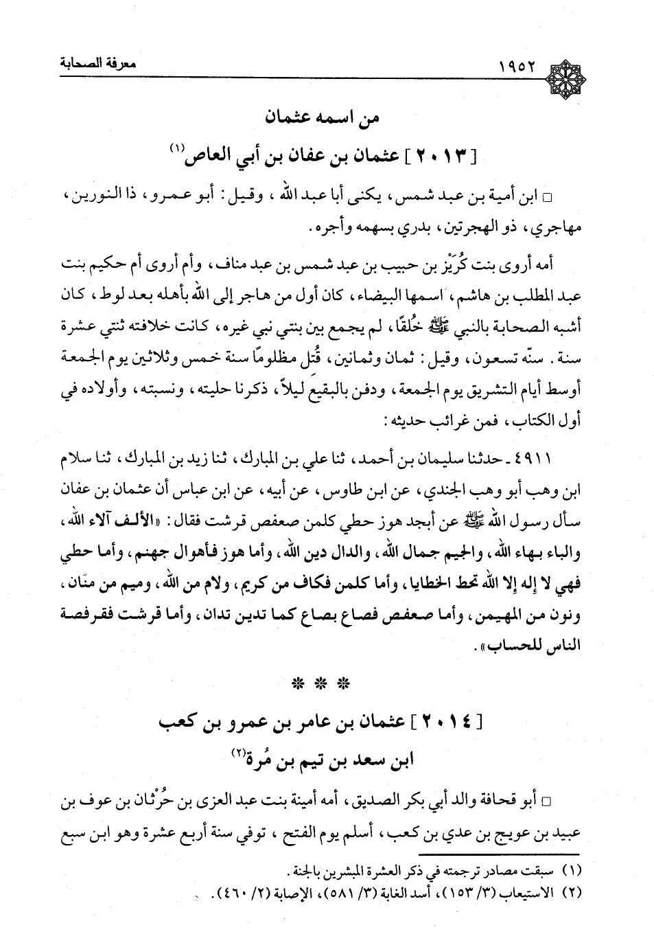 عُثْمَانُ بْنُ عَفَّانَ بْنِ أَبِي الْعَاصِ بْنِ أُمَيَّةَ بْنِ عَبْدِ شَمْسٍ يُكْنَى أَبَا عَبْدِ اللهِ، وَقِيلَ: أَبُو عَمْرٍو، ذُو النُّورَيْنِ مُهَاجِرِيٌّ، ذُو الْهِجْرَتَيْنِ، بَدْرِيٌّ بِسَهْمِهِ وَأَجْرِهِ أُمُّهُ أَرْوَى بِنْتُ كُرَيْزِ بْنِ حَبِيبِ بْنِ عَبْدِ شَمْسِ بْنِ عَبْدِ مَنَافٍ، وَأُمُّ أَرْوَى أُمُّ حَكِيمٍ بِنْتُ عَبْدِ الْمُطَّلِبِ بْنِ هَاشِمٍ، اسْمُهَا الْبَيْضَاءُ كَانَ أَوَّلَ مَنْ هَاجَرَ إِلَى اللهِ بِأَهْلِهِ بَعْدَ لُوطٍ، كَانَ أَشْبَهَ الصَّحَابَةِ بِالنَّبِيِّ صَلَّى اللَّهُ عَلَيْهِ وَسَلَّمَ خَلْقًا، لَمْ يَجْمَعْ بَيْنَ بِنْتِي نَبِيٍّ غَيْرُهُ، كَانَتْ خِلَافَتُهُ ثِنْتَيْ عَشْرَةَ سَنَةً، سِنُّهُ تِسْعُونَ، وَقِيلَ: ثَمَانٍ وَثَمَانِينَ، قُتِلَ مَظْلُومًا سَنَةَ خَمْسٍ وَثَلَاثِينَ يَوْمَ الْجُمُعَةِ أَوْسَطَ أَيَّامِ التَّشْرِيقِ يَوْمَ الْجُمُعَةِ، وَدُفِنَ بِالْبَقِيعِ لَيْلًا، ذَكَرْنَا حِلْيَتَهُ، وَنِسْبَتَهُ، وَأَوْلَادَهُ فِي أَوَّلِ الْكِتَابِ، فَمِنْ غَرَائِبِ حَدِيثِهِ