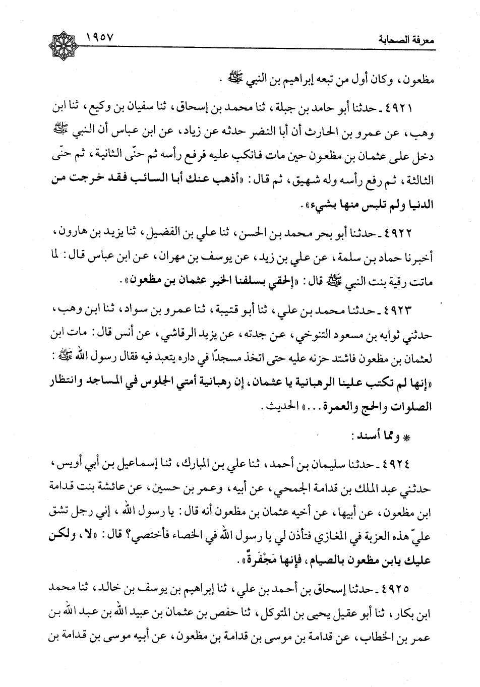 ٤٩٢٣ - حَدَّثَنَا مُحَمَّدُ بْنُ عَلِيٍّ، ثنا أَبُو قُتَيْبَةَ، ثنا عَمْرُو بْنُ سَوَادٍ، ثنا ابْنِ وَهْبٍ، حَدَّثَنِي ثَوَابَةُ بْنُ مَسْعُودٍ التَّنُوخِيُّ، عَنْ جَدَّتِهِ، عَنْ يَزِيدَ الرَّقَاشِيِّ، عَنْ أَنَسٍ، قَالَ: مَاتَ ابْنٌ لِعُثْمَانَ بْنِ مَظْعُونٍ فَاشْتَدَّ حُزْنُهُ عَلَيْهِ حَتَّى اتَّخَذَ مَسْجِدًا فِي دَارِهِ يَتَعَبَّدُ فِيهِ، فَقَالَ رَسُولُ اللهِ صَلَّى اللَّهُ عَلَيْهِ وَسَلَّمَ: «إِنَّهَا لَمْ تُكْتَبْ عَلَيْنَا الرَّهْبَانِيَّةُ يَا عُثْمَانُ، إِنَّ رَهْبَانِيَّةَ أُمَّتِي الْجُلُوسُ فِي الْمَسَاجِدِ وَانْتِظَارُ الصَّلَوَاتِ وَالْحَجُّ وَالْعُمْرَةُ» الْحَدِيثُ