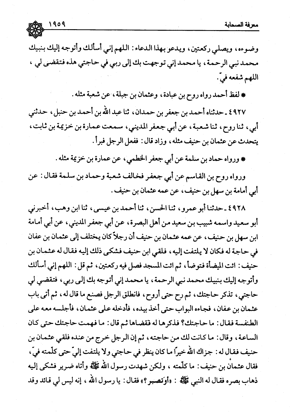 ٤٩٢٨ - حَدَّثَنَا أَبُو عَمْرٍو، ثنا الْحَسَنُ، ثنا أَحْمَدُ بْنُ عِيسَى، ثنا ابْنِ وَهْبٍ، أَخْبَرَنِي أَبُو سَعِيدٍ وَاسْمُهُ شَبِيبُ بْنُ سَعِيدٍ مِنْ أَهْلِ الْبَصْرَةِ، عَنْ أَبِي جَعْفَرٍ الْمَدِينِيِّ، عَنْ أَبِي أُمَامَةَ بْنِ سَهْلِ بْنِ حُنَيْفٍ، عَنْ عَمِّهِ عُثْمَانَ بْنِ حُنَيْفٍ أَنَّ رَجُلًا كَانَ يَخْتَلِفُ إِلَى عُثْمَانَ بْنِ عَفَّانَ فِي حَاجَةٍ لَهُ فَكَانَ لَا يَلْتَفِتُ إِلَيْهِ، فَلَقِيَ ابْنَ حُنَيْفٍ فَشَكَى ذَلِكَ إِلَيْهِ فَقَالَ لَهُ عُثْمَانُ بْنُ حُنَيْفٍ: ائْتِ الْمِيضَأَةَ فَتَوَضَّأْ، ثُمَّ ائْتِ الْمَسْجِدَ فَصَلِّ فِيهِ رَكْعَتَيْنِ، ثُمَّ قُلِ: " اللهُمَّ إِنِّي أَسْأَلُكُ وَأَتَوَجَّهُ إِلَيْكَ بِنَبِيِّكَ مُحَمَّدٍ نَبِيِّ الرَّحْمَةِ، يَا مُحَمَّدُ إِنِّي أَتَوَجَّهُ بِكَ إِلَى رَبِّي، فَتَقْضِي لِي حَاجَتِي، تَذْكُرُ حَاجَتَكَ، ثُمَّ رُحْ حَتَّى أَرْوَحَ، فَانْطَلَقَ الرَّجُلُ فَصَنَعَ مَا قَالَ لَهُ، ثُمَّ أَتَى بَابَ عُثْمَانَ بْنِ عَفَّانَ، فَجَاءَهُ الْبَوَّابُ حَتَّى أَخَذَ بِيَدِهِ، فَأَدْخَلَهُ عَلَى عُثْمَانَ، فَأَجْلَسَهُ مَعَهُ عَلَى الطِّنْفِسَةِ فَقَالَ: مَا حَاجَتُكَ؟ فَذَكَرَهَا لَهُ، فَقَضَاهَا ثُمَّ قَالَ: مَا فَهِمْتُ حَاجَتَكَ حَتَّى كَانَ السَّاعَةَ، وَقَالَ: مَا كَانَتْ لَكَ مِنْ حَاجَتِهِ، ثُمَّ إِنَّ الرَّجُلَ خَرَجَ مِنْ عِنْدِهِ فَلَقِيَ عُثْمَانَ بْنَ حُنَيْفٍ فَقَالَ لَهُ: جَزَاكَ اللهُ خَيْرًا مَا كَانَ يَنْظُرُ فِي حَاجَتِي وَلَا يَلْتَفِتُ إِلَيَّ حَتَّى كَلَّمْتَهُ فِيَّ، فَقَالَ عُثْمَانُ بْنُ حُنَيْفٍ: مَا كَلَّمْتُهُ، وَلَكِنْ شَهِدْتُ رَسُولَ اللهِ صَلَّى اللَّهُ عَلَيْهِ وَسَلَّمَ وَأَتَاهُ ضَرِيرٌ فَشَكَى إِلَيْهِ ذَهَابَ بَصَرِهِ فَقَالَ لَهُ النَّبِيُّ صَلَّى اللَّهُ عَلَيْهِ وَسَلَّمَ: «أَوَ تَصْبِرُ؟» فَقَالَ: يَا رَسُولَ اللهِ، إِنَّهُ لَيْسَ لِي قَائِدٌ وَقَدْ ⦗١٩٦٠⦘ شَقَّ عَلَيَّ، فَقَالَ لَهُ النَّبِيُّ صَلَّى اللَّهُ عَلَيْهِ وَسَلَّمَ: «ائْتِ الْمَيْضَأَةَ فَتَوَضَّأْ، ثُمَّ صَلِّ رَكْعَتَيْنِ، ثُمَّ ادْعُ بِهَذِهِ الدَّعَوَاتِ» قَالَ ابْنِ حُنَيْفٍ: فَوَاللهِ مَا تَفَرَّقْنَا وَطَالَ بِنَا الْحَدِيثُ حَتَّى دَخَلَ عَلَيْنَا الرَّجُلُ كَأَنَّهُ لَمْ يَكُنْ بِهِ ضَرَرٌ قَطُّ " رَوَاهُ عَبَّاسٌ الدُّورِيُّ عَنْ عَوْنِ بْنِ عُمَارَةَ، عَنْ رَوْحِ بْنِ الْقَاسِمِ ذَكَرَهُ بَعْضُ الْمُتَأَخِّرِينَ عَنْهُ فِي جُمْلَةِ حَدِيثِ شُعْبَةَ، وَحَمَّادٍ عَنْ أَبِي جَعْفَرٍ، عَنْ عُمَارَةَ بْنِ خُزَيْمَةَ، عَنْ عُثْمَانَ وَحَدِيثُ رَوْحٍ هُوَ عَنْ أَبِي أُمَامَةَ، عَنْ عَمِّهِ
