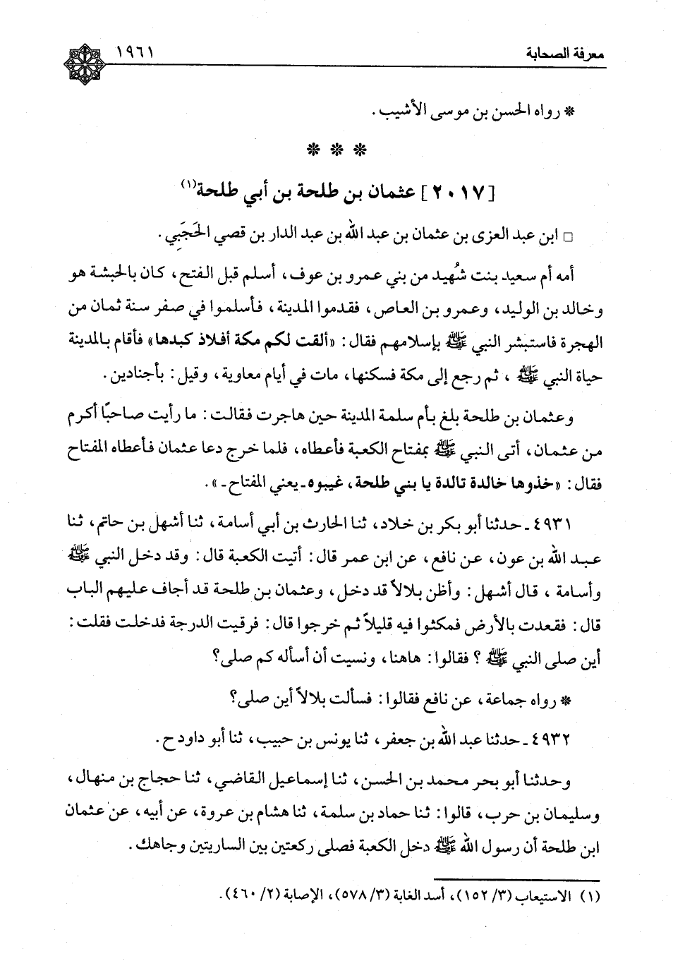 عُثْمَانُ بْنُ طَلْحَةَ بْنِ أَبِي طَلْحَةَ بْنِ عَبْدِ الْعُزَّى بْنِ عُثْمَانَ بْنِ عَبْدِ اللهِ بْنِ عَبْدِ الدَّارِ بْنِ قُصَيٍّ الْحَجَبِيُّ أُمُّهُ أُمُّ سَعِيدٍ بِنْتُ شُهَيْدٍ مِنْ بَنِي عَمْرِو بْنِ عَوْفٍ، أَسْلَمَ قَبْلَ الْفَتْحِ، كَانَ بِالْحَبَشَةِ هُوَ وَخَالِدُ بْنُ الْوَلِيدِ وَعَمْرُو بْنُ الْعَاصِ فَقَدِمُوا الْمَدِينَةَ، فَأَسْلَمُوا فِي صَفَرَ سَنَةَ ثَمَانٍ مِنَ الْهِجْرَةَ فَاسْتَبْشَرَ النَّبِيُّ صَلَّى اللَّهُ عَلَيْهِ وَسَلَّمَ بِإِسْلَامِهِمْ فَقَالَ: «أَلْقَتْ لَكُمْ مَكَّةُ أَفْلَاذَ كَبِدِهَا» فَأَقَامَ بِالْمَدِينَةِ حَيَاةَ النَّبِيِّ صَلَّى اللَّهُ عَلَيْهِ وَسَلَّمَ، ثُمَّ رَجَعَ إِلَى مَكَّةَ فَسَكَنَهَا، مَاتَ فِي أَيَّامِ مُعَاوِيَةَ، وَقِيلَ: بِأَجْنَادِينَ وَعُثْمَانُ بْنُ طَلْحَةَ بَلَغَ بِأُمِّ سَلَمَةَ الْمَدِينَةَ حِينَ هَاجَرَتْ فَقَالَتْ: مَا رَأَيْتُ صَاحِبًا أَكْرَمَ مِنْ عُثْمَانَ، أَتَى النَّبِيَّ صَلَّى اللَّهُ عَلَيْهِ وَسَلَّمَ بِمِفْتَاحِ الْكَعْبَةِ فَأَعْطَاهُ، فَلَمَّا خَرَجَ دَعَا عُثْمَانَ فَأَعْطَاهُ الْمِفْتَاحَ فَقَالَ: «خُذُوهَا خَالِدَةً تَالِدَةً يَا بَنِي طَلْحَةَ، غَيِّبُوهُ - يَعْنِي الْمِفْتَاحَ»