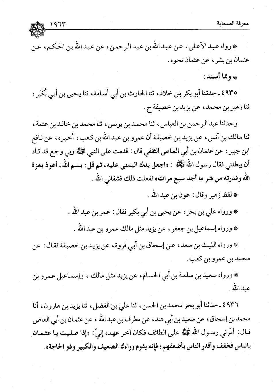 ٤٩٣٥ - وَمِمَّا أَسْنَدَ: حَدَّثَنَا أَبُو بَكْرِ بْنُ خَلَّادٍ، ثنا الْحَارِثُ بْنُ أَبِي أُسَامَةَ، ثنا يَحْيَى بْنُ أَبِي بُكَيْرٍ، ثنا زُهَيْرُ بْنُ مُحَمَّدٍ، عَنْ يَزِيدَ بْنِ خُصَيْفَةَ، ح وَحَدَّثَنَا عَبْدُ الرَّحْمَنِ بْنُ الْعَبَّاسِ، ثنا مُحَمَّدُ بْنُ يُونُسَ، ثنا مُحَمَّدُ بْنُ خَالِدِ بْنِ عَثْمَةَ، ثنا مَالِكُ بْنُ أَنَسٍ، عَنْ يَزِيدَ بْنِ خُصَيْفَةَ، أَنَّ عَمْرَو بْنَ عَبْدِ اللهِ بْنِ كَعْبٍ، أَخْبَرَهُ، عَنْ نَافِعِ بْنِ جُبَيْرٍ، عَنْ عُثْمَانَ بْنِ أَبِي الْعَاصِ الثَّقَفِيِّ، قَالَ: قَدِمْتُ عَلَى النَّبِيِّ صَلَّى اللَّهُ عَلَيْهِ وَسَلَّمَ وَبِي وَجَعٌ قَدْ كَادَ أَنْ يُبْطِلَنِي فَقَالَ رَسُولُ اللهِ صَلَّى اللَّهُ عَلَيْهِ وَسَلَّمَ: " اجْعَلْ يَدَكَ الْيُمْنَى عَلَيْهِ، ثُمَّ قُلْ: بِسْمِ اللهِ، أَعُوذُ بِعِزَّةِ اللهِ وَقُدْرَتِهِ مِنْ شَرِّ مَا أَجِدُ؛ سَبْعَ مَرَّاتٍ " فَفَعَلْتُ ذَلِكَ فَشَفَانِي اللهُ لَفْظُ زُهَيْرٍ وَقَالَ: عَوْنُ بْنُ عَبْدِ اللهِ وَرَوَاهُ عَلِيُّ بْنُ بَحْرٍ، عَنْ يَحْيَى بْنِ أَبِي بُكَيْرٍ فَقَالَ: عُمَرُ بْنُ عَبْدِ اللهِ وَرَوَاهُ إِسْمَاعِيلُ بْنُ جَعْفَرٍ، عَنْ يَزِيدَ مِثْلَ مَالِكٍ عَمْرُو بْنُ عَبْدِ اللهِ وَرَوَاهُ اللَّيْثُ بْنُ سَعْدٍ، عَنْ إِسْحَاقَ بْنِ أَبِي فَرْوَةَ، عَنْ يَزِيدَ بْنِ خُصَيْفَةَ فَقَالَ: عَنْ مُحَمَّدِ بْنِ عَمْرِو بْنِ كَعْبٍ وَرَوَاهُ سَعِيدُ بْنُ سَلَمَةَ بْنِ سَلَمَةَ بْنِ أَبِي الْحُسَامِ، عَنْ يَزِيدَ مِثْلَ مَالِكٍ، وَإِسْمَاعِيلُ عَمْرُو بْنُ عَبْدِ اللهِ