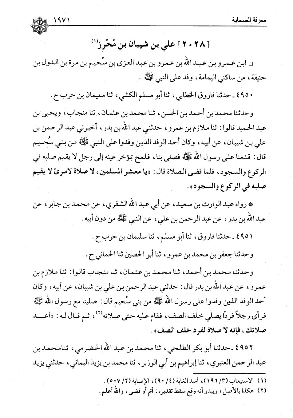 ٤٩٥٠ - حَدَّثَنَا فَارُوقٌ الْخَطَّابِيُّ، ثنا أَبُو مُسْلِمٍ الْكَشِّيُّ، ثنا سُلَيْمَانُ بْنُ حَرْبٍ، ح وَحَدَّثَنَا مُحَمَّدُ بْنُ أَحْمَدَ بْنِ الْحَسَنِ، ثنا مُحَمَّدُ بْنُ عُثْمَانَ، ثنا مِنْجَابٌ، وَيَحْيَى بْنُ عَبْدِ الْحَمِيدِ، قَالُوا: ثنا مُلَازِمُ بْنُ عَمْرٍو، حَدَّثَنِي عَبْدُ اللهِ بْنُ بَدْرٍ، أَخْبَرَنِي عَبْدُ الرَّحْمَنِ بْنُ عَلِيِّ بْنِ شَيْبَانَ، عَنْ أَبِيهِ، وَكَانَ أَحَدَ الْوَفْدِ الَّذِينَ وَفَدُوا عَلَى النَّبِيِّ صَلَّى اللَّهُ عَلَيْهِ وَسَلَّمَ مِنْ بَنِي سُحَيْمٍ قَالَ: قَدِمْنَا عَلَى رَسُولِ اللهِ صَلَّى اللَّهُ عَلَيْهِ وَسَلَّمَ فَصَلَّى بِنَا، فَلَمَحَ بِمُؤَخَّرِ عَيْنِهِ إِلَى رَجُلٍ لَا يُقِيمُ صُلْبَهُ فِي الرُّكُوعِ وَالسُّجُودِ، فَلَمَّا قَضَى الصَّلَاةَ قَالَ: «يَا مَعْشَرَ الْمُسْلِمِينَ، لَا صَلَاةَ لِامْرِئٍ لَا يُقِيمُ صُلْبَهُ فِي الرُّكُوعِ وَالسُّجُودِ» رَوَاهُ عَبْدُ الْوَارِثِ بْنُ سَعِيدٍ، عَنْ أَبِي عَبْدِ اللهِ الشَّقَرِيِّ، عَنْ مُحَمَّدِ بْنِ جَابِرٍ، عَنْ عَبْدِ اللهِ بْنِ بَدْرٍ، عَنْ عَبْدِ الرَّحْمَنِ بْنِ عَلِيٍّ، عَنِ النَّبِيِّ صَلَّى اللَّهُ عَلَيْهِ وَسَلَّمَ مِنْ دُونِ أَبِيهِ