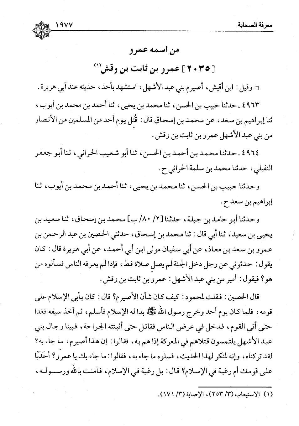 ٤٩٦٤ - حَدَّثَنَا مُحَمَّدُ بْنُ أَحْمَدَ بْنِ الْحَسَنِ، ثنا أَبُو شُعَيْبٍ الْحَرَّانِيُّ، ثنا أَبُو جَعْفَرٍ النُّفَيْلِيُّ، حَدَّثَنَا مُحَمَّدُ بْنُ سَلَمَةَ الْحَرَّانِيُّ، ح وَحَدَّثَنَا حَبِيبُ بْنُ الْحَسَنِ، ثنا مُحَمَّدُ بْنُ يَحْيَى، ثنا أَحْمَدُ بْنُ مُحَمَّدِ بْنِ أَيُّوبَ، ثنا إِبْرَاهِيمُ بْنُ سَعْدٍ، ح وَحَدَّثَنَا أَبُو حَامِدِ بْنُ جَبَلَةَ، حَدَّثَنَا مُحَمَّدُ بْنُ إِسْحَاقَ، ثنا سَعِيدُ بْنُ يَحْيَى بْنِ سَعِيدٍ، ثنا أَبِي قَالَ: ثنا مُحَمَّدُ بْنُ إِسْحَاقَ، حَدَّثَنِي الْحُصَيْنُ بْنُ عَبْدِ الرَّحْمَنِ بْنِ عَمْرِو بْنِ سَعْدِ بْنِ مُعَاذٍ، عَنْ أَبِي سُفْيَانَ، مَوْلَى ابْنِ أَبِي أَحْمَدَ، عَنْ أَبِي هُرَيْرَةَ، قَالَ: كَانَ يَقُولُ: حَدِّثُونِي عَنْ رَجُلٍ، دَخَلَ الْجَنَّةَ لَمْ يُصَلِّ صَلَاةً قَطُّ، فَإِذَا لَمْ يَعْرِفْهُ النَّاسُ فَسَأَلُوهُ مَنْ هُوَ؟ فَيَقُولُ: أَمِيرٌ مِنْ بَنِي عَبْدِ الْأَشْهَلِ: عَمْرُو بْنُ ثَابِتِ بْنِ وَقْشٍ قَالَ الْحُصَيْنُ: فَقُلْتُ لِمَحْمُودٍ: كَيْفَ كَانَ شَأْنُ الْأُصَيْرِمِ؟ قَالَ: كَانَ يَأْبَى الْإِسْلَامَ عَلَى قَوْمِهِ، فَلَمَّا كَانَ يَوْمُ أُحُدٍ وَخَرَجَ رَسُولُ اللهِ صَلَّى اللَّهُ عَلَيْهِ وَسَلَّمَ بَدَا لَهُ الْإِسْلَامُ فَأَسْلَمَ، ثُمَّ أَخَذَ سَيْفَهُ فَغَدَا حَتَّى أَتَى الْقَوْمَ، فَدَخَلَ فِي عُرْضِ النَّاسِ فَقَاتَلَ حَتَّى أَثْبَتَتْهُ الْجِرَاحَةُ، فَبَيْنَا رِجَالُ بَنِي عَبْدِ الْأَشْهَلِ يَلْتَمِسُونَ قَتْلَاهُمْ فِي الْمَعْرَكَةِ إِذَا هُمْ بِهِ، فَقَالُوا: إِنَّ هَذَا أُصَيْرِمُ مَا جَاءَ بِهِ؟ لَقَدْ تَرَكْنَاهُ، وَإِنَّهُ لَمُنْكِرٌ لِهَذَا الْحَدِيثِ، فَسَلُوهُ مَا جَاءَ بِهِ؟ فَقَالُوا: مَا جَاءَ بِكَ يَا عَمْرُو؟ أَحَدَبًا عَلَى قَوْمِكَ أَمْ رَغْبَةً فِي الْإِسْلَامِ؟ قَالَ: بَلْ رَغْبَةً فِي الْإِسْلَامِ، فَآمَنْتُ بِاللهِ وَرَسُولِهِ، ⦗١٩٧٨⦘ وَأَسْلَمْتُ وَأَخَذْتُ سَيْفِي فَقَاتَلْتُ مَعَ رَسُولِ اللهِ صَلَّى اللَّهُ عَلَيْهِ وَسَلَّمَ حَتَّى أَصَابَنِي مَا أَصَابَنِي، ثُمَّ لَمْ يَلْبَثْ أَنْ مَاتَ فِي أَيْدِيهِمْ فَذَكَرُوهُ لِرَسُولِ اللهِ صَلَّى اللَّهُ عَلَيْهِ وَسَلَّمَ فَقَالَ: «إِنَّهُ لَمِنْ أَهْلِ الْجَنَّةِ» لَفْظُ مُحَمَّدِ بْنِ سَلَمَةَ، وَإِبْرَاهِيمَ سَوَاءٌ ذَكَرَ بَعْضُ الْمُتَأَخِّرِينَ هَذَا الْحَدِيثَ وَوَهِمَ فِي شَيْئَيْنِ: ذَكَرَ أَنَّهُ عَمْرُو بْنُ ثَابِتِ بْنِ أُقَيْشِ بْنِ أُصَيْرِمِ بْنِ عَبْدِ الْأَشْهَلِ فَنَسَبَ أُقَيْشًا إِلَى أُصَيْرِمٍ وَهُوَ وَهْمٌ؛ فَإِنَّ أُصَيْرِمًا لَقَبُ عَمْرٍو وَلَيْسَ بِنَسَبِ جَدِّهِ وَقَالَ أَيْضًا: رَوَى عَنْهُ أَبُو هُرَيْرَةَ، وَوَهِمَ فَإِنَّ أَبَا هُرَيْرَةَ أَسْلَمَ بَعْدَ قَتْلِهِ بِثَلَاثِ سِنِينَ؛ لِأَنَّ عَمْرًا قُتِلَ بِأُحُدٍ فِي شَوَّالٍ مِنْ سَنَةِ ثَلَاثٍ، وَأَسْلَمَ أَبُو هُرَيْرَةَ عَامَ خَيْبَرَ أَوَّلَ سَنَةِ سَبْعٍ وَرَوَاهُ جَمَاعَةٌ عَنْ مُحَمَّدِ بْنِ إِسْحَاقَ وَرَوَاهُ أَيْضًا مُحَمَّدُ بْنُ عَمْرٍو، عَنْ أَبِي سَلَمَةَ، عَنْ أَبِي هُرَيْرَةَ