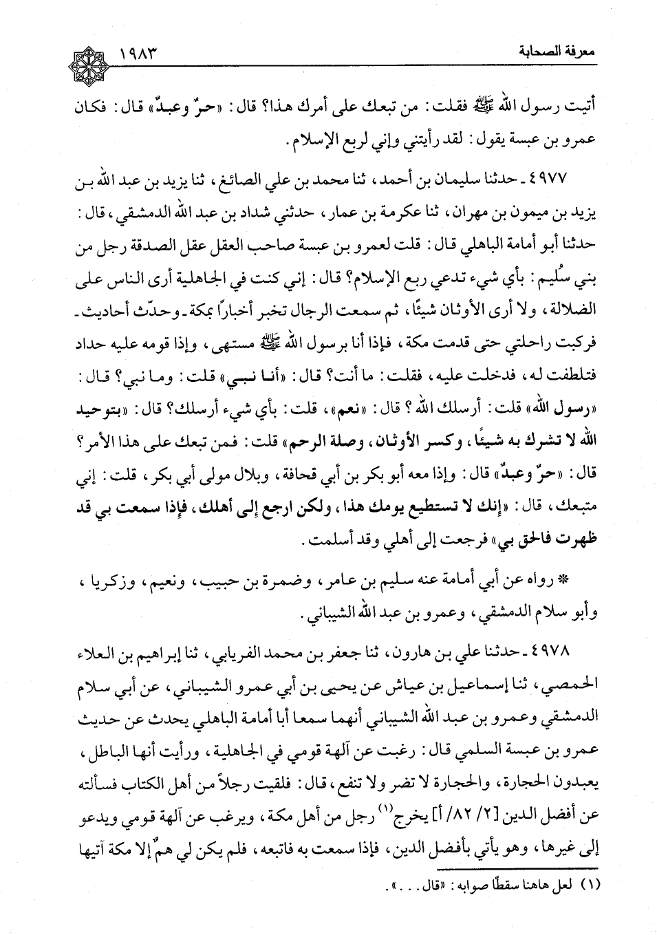 ٤٩٧٧ - حَدَّثَنَا سُلَيْمَانُ بْنُ أَحْمَدَ، ثنا مُحَمَّدُ بْنُ عَلِيٍّ الصَّائِغُ، ثنا يَزِيدُ بْنُ عَبْدِ اللهِ بْنِ يَزِيدَ بْنِ مَيْمُونِ بْنِ مِهْرَانَ، ثنا عِكْرِمَةُ بْنُ عَمَّارٍ، حَدَّثَنِي شَدَّادُ بْنُ عَبْدِ اللهِ الدِّمَشْقِيُّ، قَالَ: حَدَّثَنَا أَبُو أُمَامَةَ الْبَاهِلِيُّ، قَالَ: قُلْتُ لِعَمْرِو بْنِ عَبَسَةَ صَاحِبِ الْعَقْلِ عَقْلِ الصَّدَقَةِ - رَجُلٌ مِنْ بَنِي سُلَيْمٍ -: بِأَيِّ شَيْءٍ تَدَّعِي رُبْعَ الْإِسْلَامِ؟ قَالَ: إِنِّي كُنْتُ فِي الْجَاهِلِيَّةِ أَرَى النَّاسَ عَلَى الضَّلَالَةِ، وَلَا أَرَى الْأَوْثَانَ شَيْئًا، ثُمَّ سَمِعْتُ الرِّجَالَ تُخْبِرُ أَخْبَارًا بِمَكَّةَ - وَحَدَّثَ أَحَادِيثَ - فَرَكِبْتُ رَاحِلَتِي حَتَّى قَدِمْتُ مَكَّةَ، فَإِذَا أَنَا بِرَسُولِ اللهِ صَلَّى اللَّهُ عَلَيْهِ وَسَلَّمَ مُسْتَهًى، وَإِذَا قَوْمُهُ عَلَيْهِ حِدَادٌ فَتَلَطَّفْتُ لَهُ، فَدَخَلْتُ عَلَيْهِ، فَقُلْتُ: مَا أَنْتَ؟ قَالَ: «أَنَا نَبِيٌّ» قُلْتُ: وَمَا نَبِيٌّ؟ قَالَ: «رَسُولُ اللهِ» قُلْتُ: أَرْسَلَكَ اللهُ؟ قَالَ: «نَعَمْ» ، قُلْتُ: بِأَيِّ شَيْءٍ أَرْسَلَكَ؟ قَالَ: «بِتَوْحِيدِ اللهِ لَا تُشْرِكُ بِهِ شَيْئًا، وَكَسْرِ الْأَوْثَانِ، وَصِلَةِ الرَّحِمِ» قُلْتُ: فَمَنْ تَبِعَكَ عَلَى هَذَا الْأَمْرِ؟ قَالَ: «حُرٌّ وَعَبْدٌ» قَالَ: وَإِذَا مَعَهُ أَبُو بَكْرِ بْنُ أَبِي قُحَافَةَ، وَبِلَالٌ مَوْلَى أَبِي بَكْرٍ، قُلْتُ: إِنِّي مُتَّبِعُكَ، قَالَ: «إِنَّكَ لَا تَسْتَطِيعُ يَوْمَكَ هَذَا، وَلَكِنِ ارْجِعْ إِلَى أَهْلِكَ، فَإِذَا سَمِعْتَ بِيَ قَدْ ظَهَرْتُ فَالْحَقْ بِي» فَرَجَعْتُ إِلَى أَهْلِي وَقَدْ أَسْلَمْتُ رَوَاهُ عَنْ أَبِي أُمَامَةَ عَنْهُ سُلَيْمُ بْنُ عَامِرٍ، وَضَمْرَةُ بْنُ حَبِيبٍ، وَنُعَيْمٌ، وَزَكَرِيَّا، وَأَبُو سَلَامٍ الدِّمَشْقِيُّ، وَعَمْرُو بْنُ عَبْدِ اللهِ الشَّيْبَانِيُّ