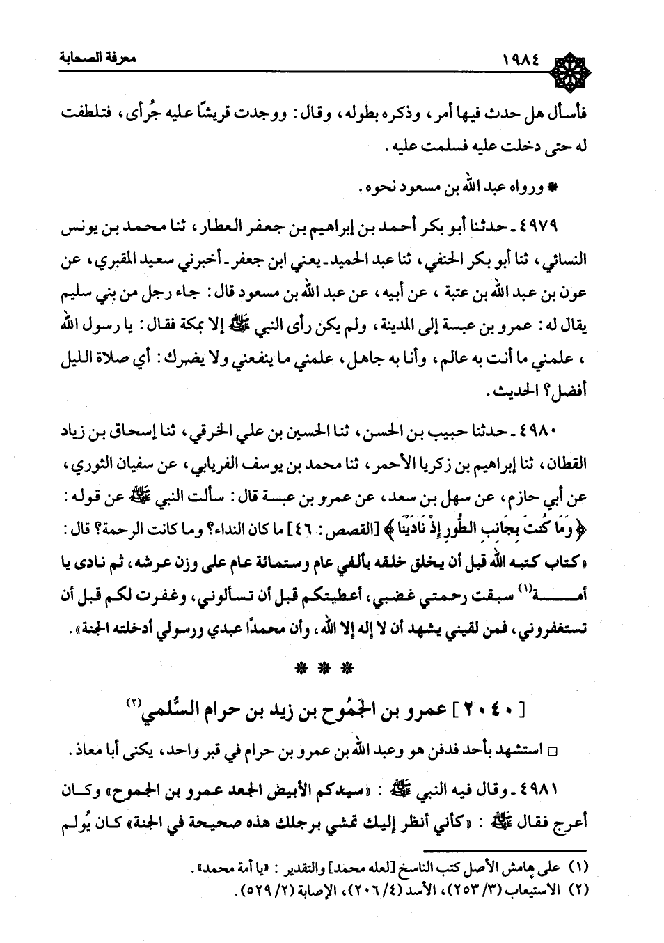 ٤٩٨١ - وَقَالَ فِيهِ النَّبِيُّ صَلَّى اللَّهُ عَلَيْهِ وَسَلَّمَ: «سَيِّدُكُمُ الْأَبْيَضُ الْجَعْدُ عَمْرُو بْنُ الْجَمُوحِ» وَكَانَ أَعْرَجَ فَقَالَ صَلَّى اللَّهُ عَلَيْهِ وَسَلَّمَ: «كَأَنِّي أَنْظُرُ إِلَيْكَ تَمْشِي بِرِجْلِكَ هَذِهِ صَحِيحَةً فِي الْجَنَّةِ» كَانَ يُولِمُ ⦗١٩٨٥⦘ عَلَى رَسُولِ اللهِ صَلَّى اللَّهُ عَلَيْهِ وَسَلَّمَ إِذَا تَزَوَّجَ، وَكَانَ فِي الْجَاهِلِيَّةِ عَلَى أَصْنَامِهِمْ، حَدِيثُهُ عِنْدَ أَبِي قَتَادَةَ، وَجَابِرٍ