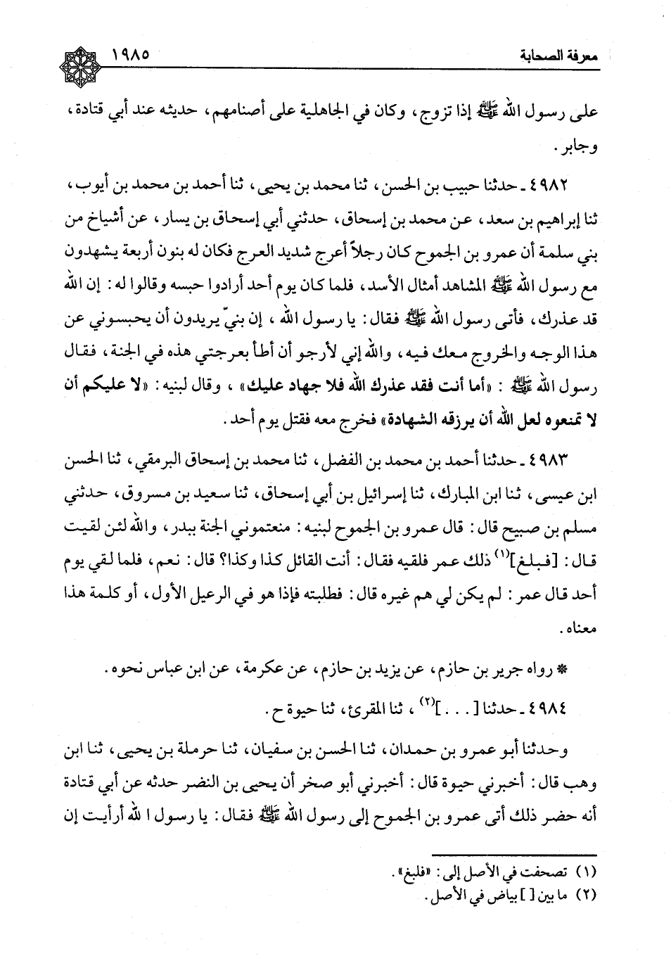 ٤٩٨٢ - حَدَّثَنَا حَبِيبُ بْنُ الْحَسَنِ، ثنا مُحَمَّدُ بْنُ يَحْيَى، ثنا أَحْمَدُ بْنُ مُحَمَّدِ بْنِ أَيُّوبَ، ثنا إِبْرَاهِيمُ بْنُ سَعْدٍ، عَنْ مُحَمَّدِ بْنِ إِسْحَاقَ، حَدَّثَنِي أَبِي إِسْحَاقُ بْنُ يَسَارٍ، عَنْ أَشْيَاخٍ، مِنْ بَنِي سَلَمَةَ أَنَّ عَمْرَو بْنَ الْجَمُوحِ، كَانَ رَجُلًا أَعْرَجَ شَدِيدَ الْعَرَجِ فَكَانَ لَهُ بَنُونَ أَرْبَعَةٌ يَشْهَدُونَ مَعَ رَسُولِ اللهِ صَلَّى اللَّهُ عَلَيْهِ وَسَلَّمَ الْمَشَاهِدَ أَمْثَالَ الْأُسْدِ، فَلَمَّا كَانَ يَوْمُ أُحُدٍ أَرَادُوا حَبْسَهُ وَقَالُوا لَهُ: إِنَّ اللهَ قَدْ عَذَرَكَ، فَأَتَى رَسُولَ اللهِ صَلَّى اللَّهُ عَلَيْهِ وَسَلَّمَ فَقَالَ: يَا رَسُولَ اللهِ، إِنَّ بَنِيَّ يُرِيدُونَ أَنْ يَحْبِسُونِي عَنْ هَذَا الْوَجْهِ وَالْخُرُوجِ مَعَكَ فِيهِ، وَاللهِ إِنِّي لَأَرْجُو أَنْ أَطَأَ بِعَرْجَتِي هَذِهِ فِي الْجَنَّةِ، فَقَالَ رَسُولُ اللهِ صَلَّى اللَّهُ عَلَيْهِ وَسَلَّمَ: «أَمَّا أَنْتَ فَقَدْ عَذَرَكَ اللهُ فَلَا جِهَادَ عَلَيْكَ» ، وَقَالَ لِبَنِيهِ: «لَا عَلَيْكُمْ أَنْ لَا تَمْنَعُوهُ لَعَلَّ اللهَ أَنْ يَرْزُقَهُ الشَّهَادَةَ» فَخَرَجَ مَعَهُ فَقُتِلَ يَوْمَ أُحُدٍ