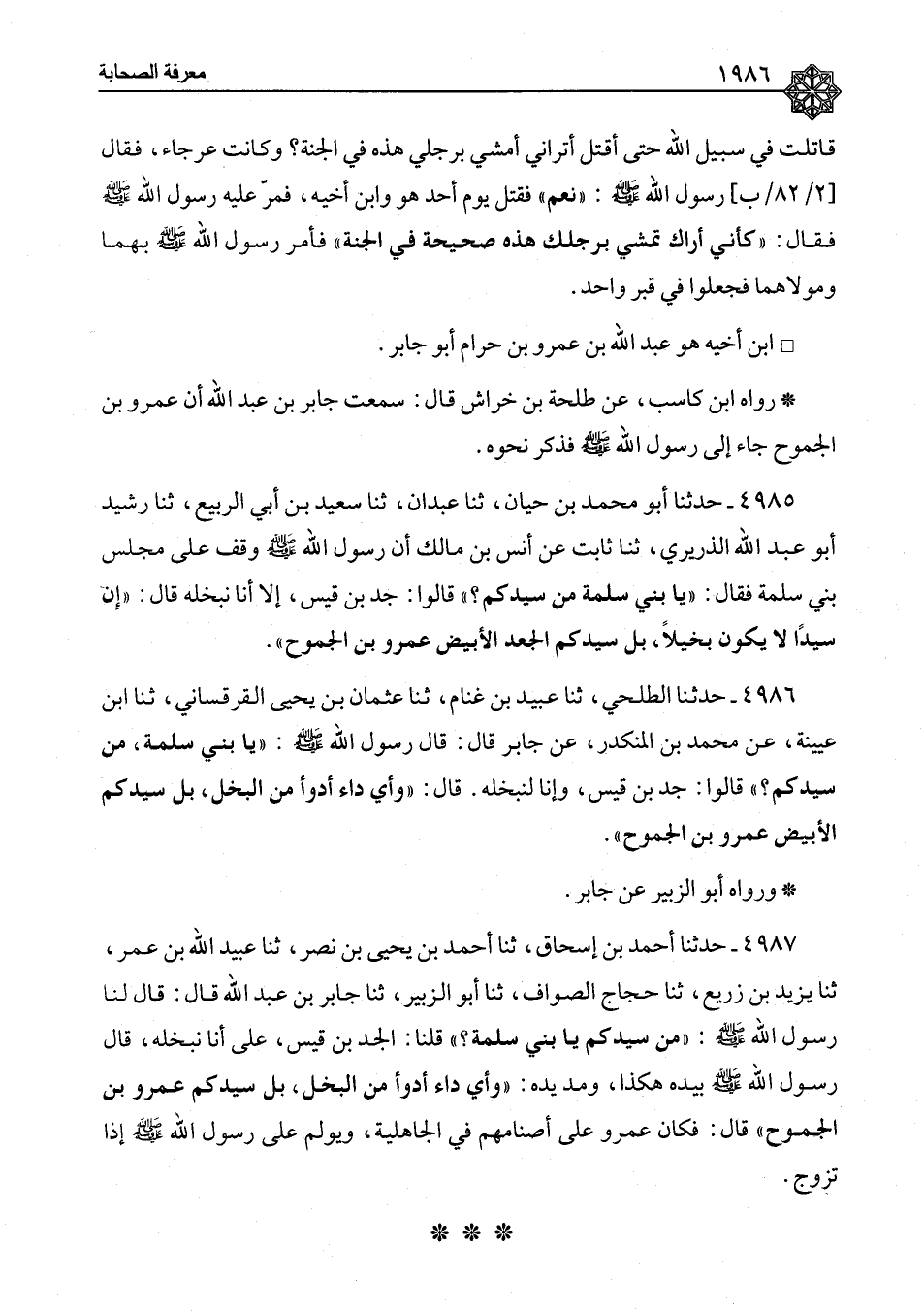 ٤٩٨٥ - حَدَّثَنَا أَبُو مُحَمَّدِ بْنُ حَيَّانَ، ثنا عَبْدَانُ، ثنا سَعِيدُ بْنُ أَبِي الرَّبِيعِ، ثنا رُشَيْدٌ أَبُو عَبْدِ اللهِ الذَّرِيرِيُّ،، ثنا ثَابِتٌ، عَنْ أَنَسِ بْنِ مَالِكٍ، أَنَّ رَسُولَ اللهِ صَلَّى اللَّهُ عَلَيْهِ وَسَلَّمَ وَقَفَ عَلَى مَجْلِسِ بَنِي سَلَمَةَ فَقَالَ: «يَا بَنِي سَلَمَةَ مَنْ سَيِّدُكُمْ؟» قَالُوا: جَدُّ بْنُ قَيْسٍ إِلَّا أَنَّا نُبَخِّلُهُ قَالَ: «إِنَّ سَيِّدًا لَا يَكُونُ بَخِيلًا بَلْ سُيِّدُكُمُ الْجَعْدُ الْأَبْيَضُ عَمْرُو بْنُ الْجَمُوحِ»