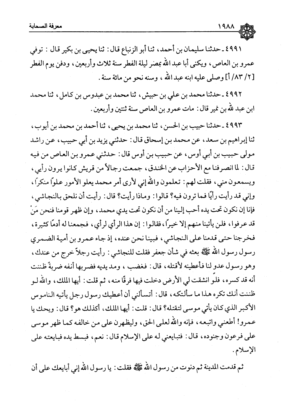 ٤٩٩٢ - حَدَّثَنَا مُحَمَّدُ بْنُ عَلِيِّ بْنِ حُبَيْشٍ، ثنا مُحَمَّدُ بْنُ عَبْدُوسِ بْنِ كَامِلٍ، ثنا مُحَمَّدُ بْنُ عَبْدِ اللهِ بْنِ نُمَيْرٍ، قَالَ: «مَاتَ عَمْرُو بْنُ الْعَاصِ سَنَةَ ثِنْتَيْنِ وَأَرْبَعِينَ»