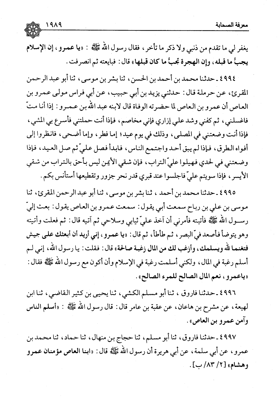 ٤٩٩٦ - حَدَّثَنَا فَارُوقٌ، ثنا أَبُو مُسْلِمٍ الْكَشِّيُّ، ثنا يَحْيَى بْنُ كَثِيرٍ الْقَاضِي، ثنا ابْنُ لَهِيعَةَ، عَنْ مِشْرَحِ بْنِ هَاعَانَ، عَنْ عُقْبَةَ بنِ عَامِرٍ، قَالَ: قَالَ رَسُولُ اللهِ صَلَّى اللَّهُ عَلَيْهِ وَسَلَّمَ: «أَسْلَمَ النَّاسُ وَآمَنَ عَمْرُو بْنُ الْعَاصِ»