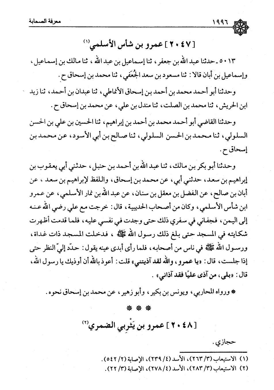 ٥٠١٣ - حَدَّثَنَا عَبْدُ اللهِ بْنُ جَعْفَرٍ، ثنا إِسْمَاعِيلُ بْنُ عَبْدِ اللهِ، ثنا مَالِكُ بْنُ إِسْمَاعِيلَ، وَإِسْمَاعِيلُ بْنُ أَبَانَ، قَالَا: ثنا مَسْعُودُ بْنُ سَعْدٍ الْجُعْفِيُّ، ثنا مُحَمَّدُ بْنُ إِسْحَاقَ، ح وَحَدَّثَنَا أَبُو أَحْمَدَ مُحَمَّدُ بْنُ أَحْمَدَ بْنِ إِسْحَاقَ الْأَنْمَاطِيُّ، ثنا عَبْدَانُ بْنُ أَحْمَدَ، ثنا زَيْدُ بْنُ الْحَرِيشِ، ثنا مُحَمَّدُ بْنُ الصَّلْتِ، ثنا مِنْدَلُ بْنُ عَلِيٍّ، عَنْ مُحَمَّدِ بْنِ إِسْحَاقَ، ح وَحَدَّثَنَا الْقَاضِي أَبُو أَحْمَدَ مُحَمَّدُ بْنُ أَحْمَدَ بْنِ إِبْرَاهِيمَ، ثنا الْحُسَيْنُ بْنُ عَلِيِّ بْنِ الْحَسَنِ السَّلُولِيُّ، ثنا مُحَمَّدُ بْنُ الْحَسَنِ السَّلُولِيُّ، ثنا صَالِحُ بْنُ أَبِي الْأَسْوَدِ، عَنْ مُحَمَّدِ بْنِ إِسْحَاقَ، ح وَحَدَّثَنَا أَبُو بَكْرِ بْنُ مَالِكٍ، ثنا عَبْدُ اللهِ بْنُ أَحْمَدَ بْنِ حَنْبَلٍ، حَدَّثَنِي يَعْقُوبُ بْنُ إِبْرَاهِيمَ بْنِ سَعْدٍ، حَدَّثَنِي أَبِي، عَنْ مُحَمَّدِ بْنِ إِسْحَاقَ، وَاللَّفْظُ، لِإِبْرَاهِيمَ بْنِ سَعْدٍ، عَنْ أَبَانَ بْنِ صَالِحٍ، عَنِ الْفَضْلِ بْنِ مَعْقِلِ بْنِ سِنَانٍ، عَنْ عَبْدِ اللهِ بْنِ نَمَّارٍ الْأَسْلَمِيِّ، عَنْ عَمْرِو بْنِ شَأْسٍ الْأَسْلَمِيِّ، وَكَانَ، مِنْ أَصْحَابِ الْحُدَيْبِيَةِ قَالَ: خَرَجْتُ مَعَ عَلِيٍّ رَضِيَ اللهُ عَنْهُ إِلَى الْيَمَنِ، فَجَفَانِي فِي سَفَرِي ذَلِكَ حَتَّى وَجَدْتُ فِي نَفْسِي عَلَيْهِ، فَلَمَّا قَدِمْتُ أَظْهَرْتُ شِكَايَتَهُ فِي الْمَسْجِدِ حَتَّى بَلَغَ ذَلِكَ رَسُولَ اللهِ صَلَّى اللَّهُ عَلَيْهِ وَسَلَّمَ، فَدَخَلْتُ الْمَسْجِدَ ذَاتَ غَدَاةٍ، وَرَسُولُ اللهِ صَلَّى اللَّهُ عَلَيْهِ وَسَلَّمَ فِي نَاسٍ مِنْ أَصْحَابِهِ، فَلَمَّا رَأَى أَبْدَى عَيْنَهُ يَقُولُ: حَدَّدَ إِلَيَّ النَّظَرَ حَتَّى إِذَا جَلَسْتُ، قَالَ: «يَا عَمْرُو، وَاللهِ لَقَدْ آذَيْتَنِي» ، قُلْتُ: أَعُوذُ بِاللهِ أَنْ أُوذِيَكَ يَا رَسُولَ اللهِ، قَالَ: «بَلَى، مَنْ آذَى عَلِيًّا فَقَدْ آذَانِي» وَرَوَاهُ الْمُحَارِبِيُّ، وَيُونُسُ بْنُ بُكَيْرٍ، وَأَبُو زُهَيْرٍ، عَنْ مُحَمَّدِ بْنِ إِسْحَاقَ، نَحْوَهُ