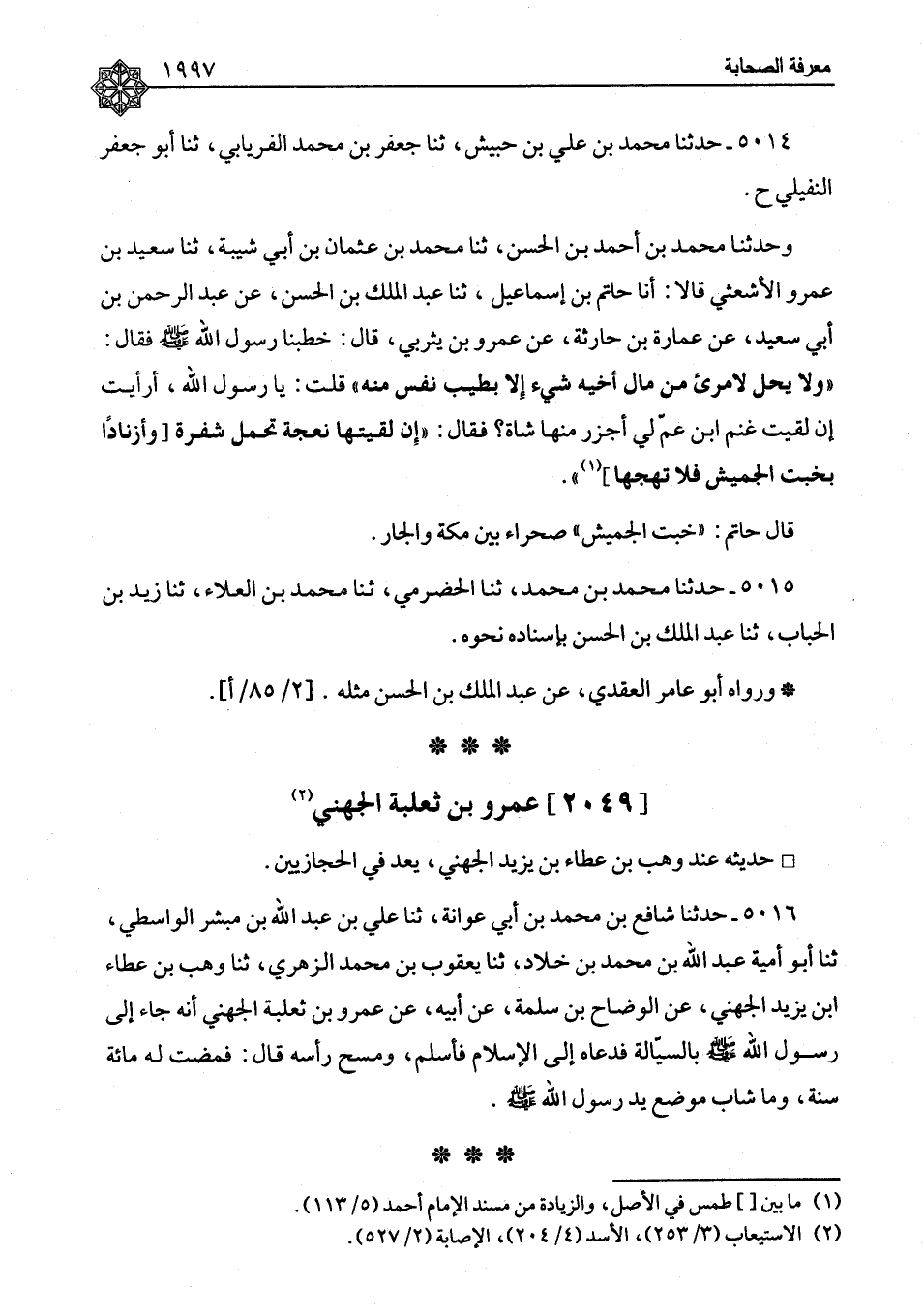 ٥٠١٤ - حَدَّثَنَا مُحَمَّدُ بْنُ عَلِيِّ بْنِ حُبَيْشٍ، ثنا جَعْفَرُ بْنُ مُحَمَّدِ بْنِ الْفِرْيَابِيُّ، ثنا أَبُو جَعْفَرٍ النُّفَيْلِيُّ، ح، وَحَدَّثَنَا مُحَمَّدُ بْنُ أَحْمَدَ بْنِ الْحَسَنِ، ثنا مُحَمَّدُ بْنُ عُثْمَانَ بْنِ أَبِي شَيْبَةَ، ثنا سَعِيدُ بْنُ عَمْرٍو الْأَشْعَثِيُّ، قَالَا: أنا حَاتِمُ بْنُ إِسْمَاعِيلَ، ثنا عَبْدُ الْمَلِكِ بْنُ الْحَسَنِ، عَنْ عَبْدِ الرَّحْمَنِ بْنِ أَبِي سَعِيدٍ، عَنْ عُمَارَةَ بْنِ حَارِثَةَ، عَنْ عَمْرِو بْنِ يَثْرِبِيٍّ، قَالَ: خَطَبَنَا رَسُولُ اللهِ صَلَّى اللَّهُ عَلَيْهِ وَسَلَّمَ، فَقَالَ: «وَلَا يَحِلُّ لِامْرِئٍ مِنْ مَالِ أَخِيهِ شَيْءٌ إِلَّا بِطِيبِ نَفْسٍ مِنْهُ» ، قُلْتُ: يَا رَسُولَ اللهِ، أَرَأَيْتَ إِنْ لَقِيتُ غَنْمَ ابْنِ عَمٍّ لِي أجْزُرْ مِنْهَا شَاةً؟ فَقَالَ: «إِنْ لَقِيتَهَا نَعْجَةً تَحْمِلُ شَفْرَةً وَأَزْنَادًا بِخَبْتِ الْجَمِيشِ فَلَا تَهِجْهَا» قَالَ حَاتِمٌ: «خَبْتُ الْجَمِيشِ» ، صَحْرَاءُ بَيْنَ مَكَّةَ وَالْجَارِ