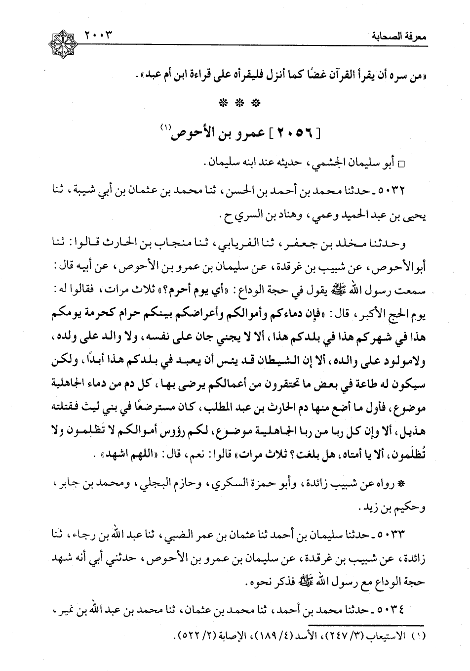 ٥٠٣٢ - حَدَّثَنَا مُحَمَّدُ بْنُ أَحْمَدَ بْنِ الْحَسَنِ، ثنا مُحَمَّدُ بْنُ عُثْمَانَ بْنِ أَبِي شَيْبَةَ، ثنا يَحْيَى بْنُ عَبْدِ الْحَمِيدِ، وَعَمِّي، وَهَنَّادُ بْنُ السَّرِيِّ، ح، وَحَدَّثَنَا مَخْلَدُ بْنُ جَعْفَرٍ، ثنا الْفِرْيَابِيُّ، ثنا مِنْجَابُ بْنُ الْحَارِثِ، قَالُوا: ثنا أَبُو الْأَحْوَصِ، عَنْ شَبِيبِ بْنِ غَرْقَدَةَ، عَنْ سُلَيْمَانَ بْنِ عَمْرِو بْنِ الْأَحْوَصِ، عَنْ أَبِيهِ، قَالَ: سَمِعْتُ رَسُولَ اللهِ صَلَّى اللَّهُ عَلَيْهِ وَسَلَّمَ يَقُولُ فِي حَجَّةِ الْوَدَاعِ: «أَيُّ يَوْمٍ أَحْرَمُ؟» ثَلَاثَ مَرَّاتٍ، فَقَالُوا لَهُ: يَوْمُ الْحَجِّ الْأَكْبَرِ، قَالَ: «فَإِنَّ دَمَاءَكُمْ، وَأَمْوَالَكُمْ، وَأَعْرَاضَكُمْ بَيْنَكُمْ حَرَامٌ كَحُرْمَةِ يَوْمِكُمْ هَذَا، فِي شَهْرِكُمْ هَذَا، فِي بَلَدِكُمْ هَذَا، أَلَا لَا يَجْنِي جَانٍّ عَلَى نَفْسِهِ، وَلَا وَالِدٌ عَلَى وَلَدِهِ، وَلَا مَوْلُودٌ عَلَى وَالِدِهِ، أَلَا إِنَّ الشَّيْطَانَ قَدْ يَئِسَ أَنْ يُعْبُدَ فِي بَلَدِكُمْ هَذَا أَبَدًا، وَلَكِنْ سَيَكُونُ لَهُ طَاعَةٌ فِي بَعْضِ مَا تَحْتَقِرُونَ مِنْ أَعْمَالِكُمْ يَرْضَى بِهَا، كُلُّ دَمٍ مِنْ دِمَاءِ الْجَاهِلِيَّةِ مَوْضُوعٌ، فَأَوَّلُ مَا أَضَعُ مِنْهَا دَمَ الْحَارِثِ بْنِ عَبْدِ الْمُطَّلِبِ، كَانَ مُسْتَرْضِعًا فِي بَنِي لَيْثٍ، فَقَتَلَتْهُ هُذَيْلٌ، أَلَا وَإِنَّ كُلَّ رِبًا مِنْ رِبَا الْجَاهِلِيَّةِ مَوْضُوعٌ، لَكُمْ رُءُوسُ أَمْوَالِكُمْ لَا تَظْلِمُونَ وَلَا تُظْلَمُونَ، أَلَا يَا أُمَّتَاهُ، هَلْ بَلَّغْتُ» ؟ ثَلَاثَ مَرَّاتٍ، قَالُوا: نَعَمْ، قَالَ: «اللهُمَّ اشْهَدْ» رَوَاهُ عَنْ شَبِيبٍ زَائِدَةُ، وَأَبُو حَمْزَةَ السُّكَّرِيُّ، وَحَازِمٌ الْبَجَلِيُّ، وَمُحَمَّدُ بْنُ جَابِرٍ، وَحَكِيمُ بْنُ زَيْدٍ