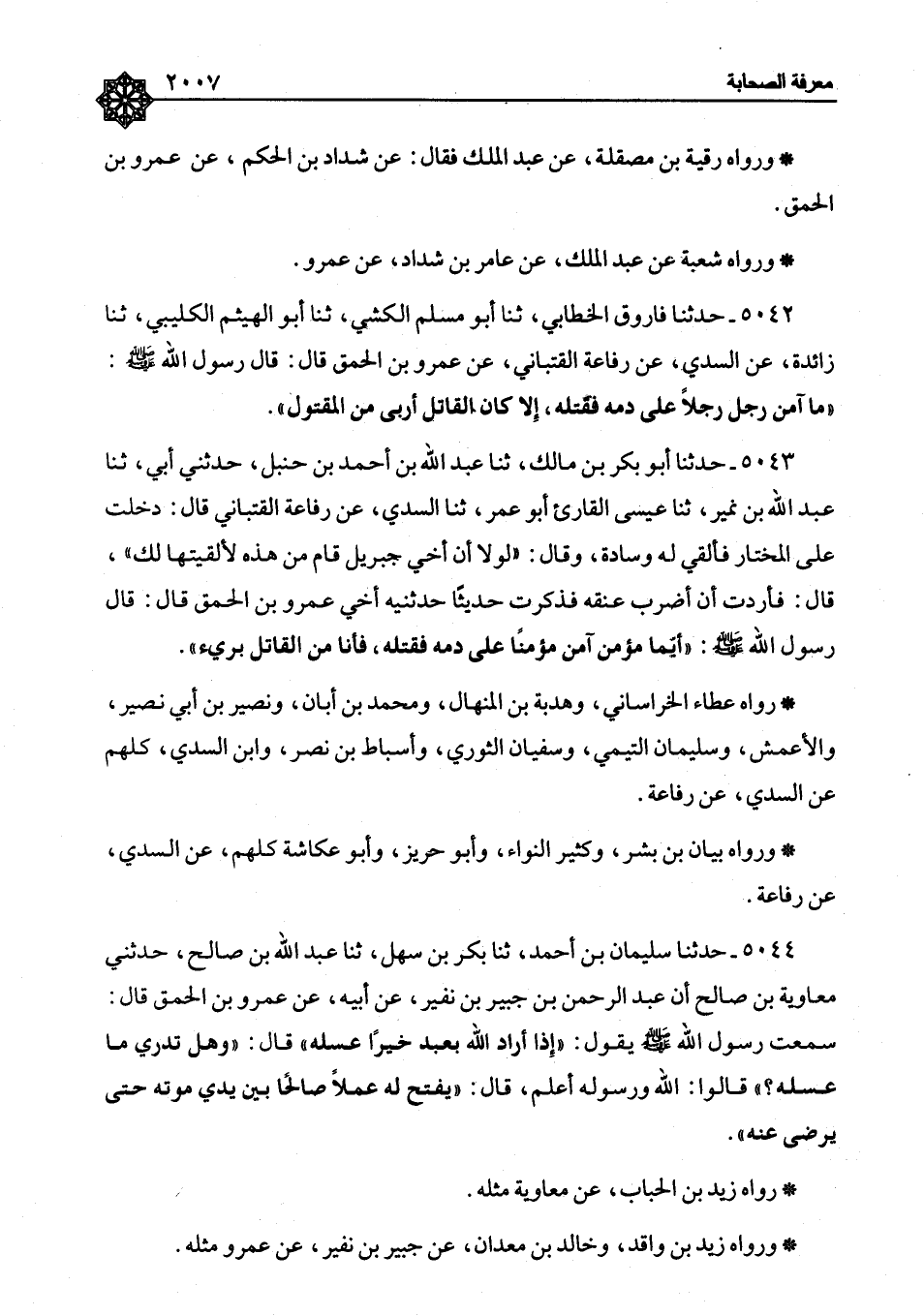 ٥٠٤٢ - حَدَّثَنَا فَارُوقٌ الْخَطَّابِيُّ، ثنا أَبُو مُسْلِمٍ الْكَشِّيُّ، ثنا أَبُو الْهَيْثَمِ الْكُلَيْبِيُّ، ثنا زَائِدَةُ، عَنِ السُّدِّيِّ، عَنْ رِفَاعَةَ الْقِتْبَانِيِّ، عَنْ عَمْرِو بْنِ الْحَمِقِ، قَالَ: قَالَ رَسُولُ اللهِ صَلَّى اللَّهُ عَلَيْهِ وَسَلَّمَ: «مَا آمَنَ رَجُلٌ رَجُلًا عَلَى دَمِهِ فَقَتَلَهُ، إِلَّا كَانَ الْقَاتِلُ أَرْبَى مِنَ الْمَقْتُولِ»