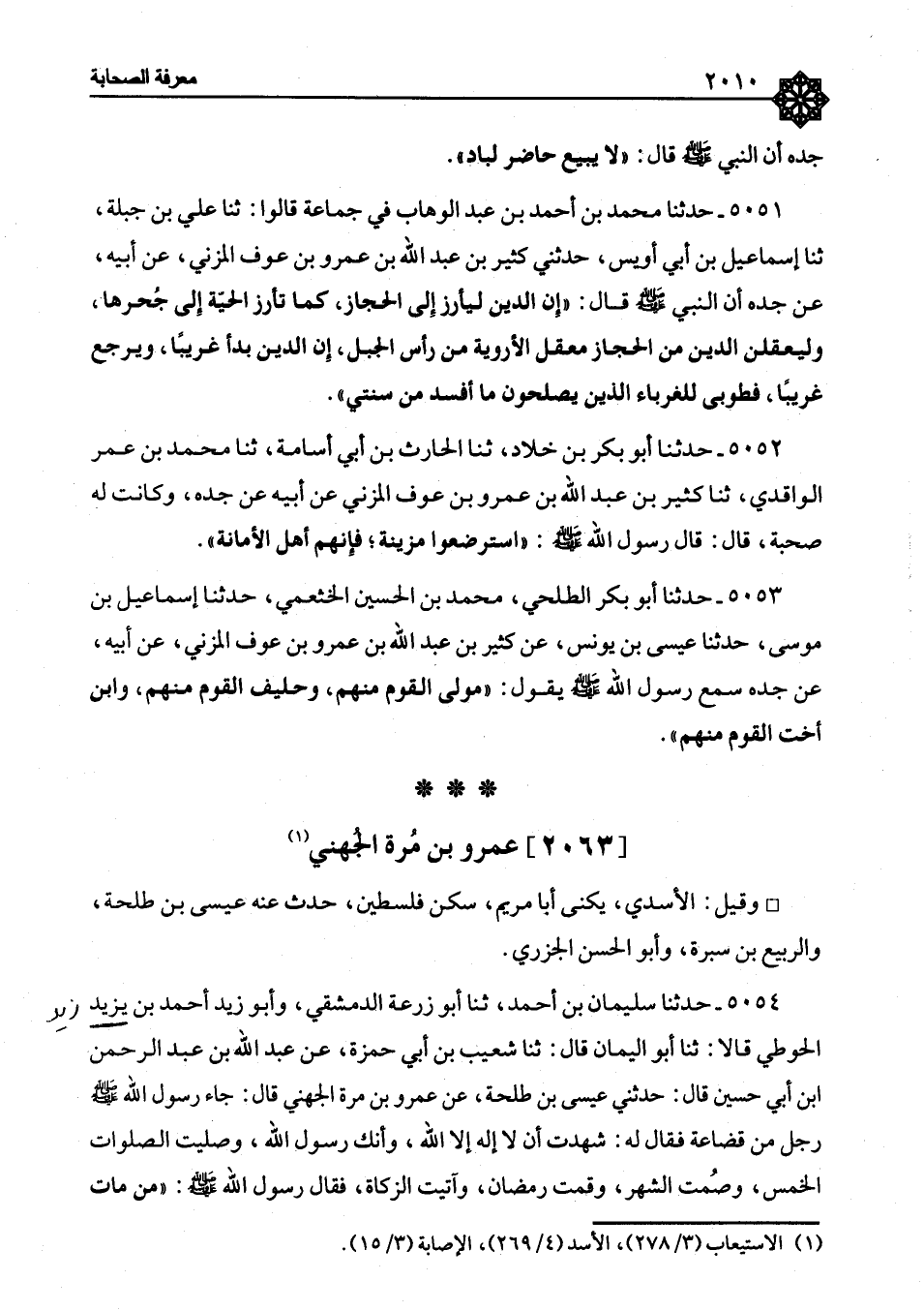 ٥٠٥٦ - حَدَّثَنَا سُلَيْمَانُ، حَدَّثَنَا أَبُو الزِّنْبَاعِ، ثنا عَمْرُو بْنُ خَالِدٍ الْحَرَّانِيُّ، ثنا ابْنُ لَهِيعَةَ، ح وَحَدَّثَنَا مُحَمَّدُ بْنُ أَحْمَدَ بْنِ الْحَسَنِ، ثنا مُحَمَّدُ بْنُ عُثْمَانَ بْنِ أَبِي شَيْبَةَ، ثنا اللَّيْثُ بْنُ هَارُونَ، ثنا زَيْدُ بْنُ الْحُبَابِ، ثنا ابْنُ لَهِيعَةَ، عَنْ عُبَيْدِ اللهِ بْنِ أَبِي جَعْفَرٍ، عَنْ عِيسَى بْنِ طَلْحَةَ، عَنْ عَمْرٍو الْجُهَنِيِّ، قَالَ: جَاءَ رَجُلٌ مِنْ قُضَاعَةَ رَسُولَ اللهِ صَلَّى اللَّهُ عَلَيْهِ وَسَلَّمَ، فَذَكَرَ نَحْوَهُ