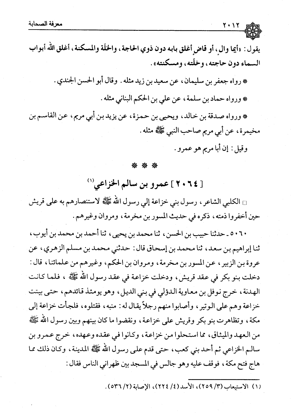 عَمْرُو بْنُ سَالِمٍ الْخُزَاعِيُّ الْكَلْبِيُّ الشَّاعِرُ، رَسُولُ بَنِي خُزَاعَةَ إِلَى رَسُولِ اللهِ صَلَّى اللَّهُ عَلَيْهِ وَسَلَّمَ؛ لَاسْتُنَصَارِهِمْ بِهِ عَلَى قُرَيْشٍ حِينَ أَخْفَرُوا ذِمَّتَهُ، ذِكْرُهُ فِي حَدِيثِ الْمِسْوَرِ بْنِ مَخْرَمَةَ، وَمَرْوَانَ، وَغَيْرِهِمْ