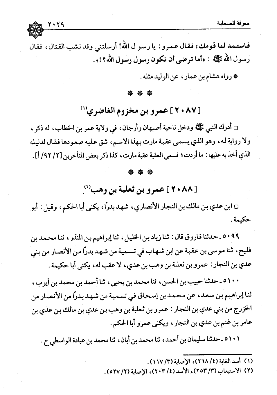 ٥١٠٠ - حَدَّثَنَا حَبِيبُ بْنُ الْحَسَنِ، ثنا مُحَمَّدُ بْنُ يَحْيَى، ثنا أَحْمَدُ بْنُ مُحَمَّدِ بْنِ أَيُّوبَ، ثنا إِبْرَاهِيمُ بْنُ سَعْدٍ، عَنْ مُحَمَّدِ بْنِ إِسْحَاقَ، " فِي تَسْمِيَةِ مَنْ شَهِدَ بَدْرًا مِنَ الْأَنْصَارِ مِنَ الْخَزْرَجِ مِنْ بَنِي عَدِيِّ بْنِ النَّجَّارِ: عَمْرُو بْنُ ثَعْلَبَةَ بْنِ وَهْبِ بْنِ عَدِيِّ بْنِ مَالِكِ بْنِ عَدِيِّ بْنِ عَامِرِ بْنِ غَنْمِ بْنِ عَدِيِّ بْنِ النَّجَّارِ، وَيُكَنَّى عَمْرًا أَبَا الْحَكَمِ "
