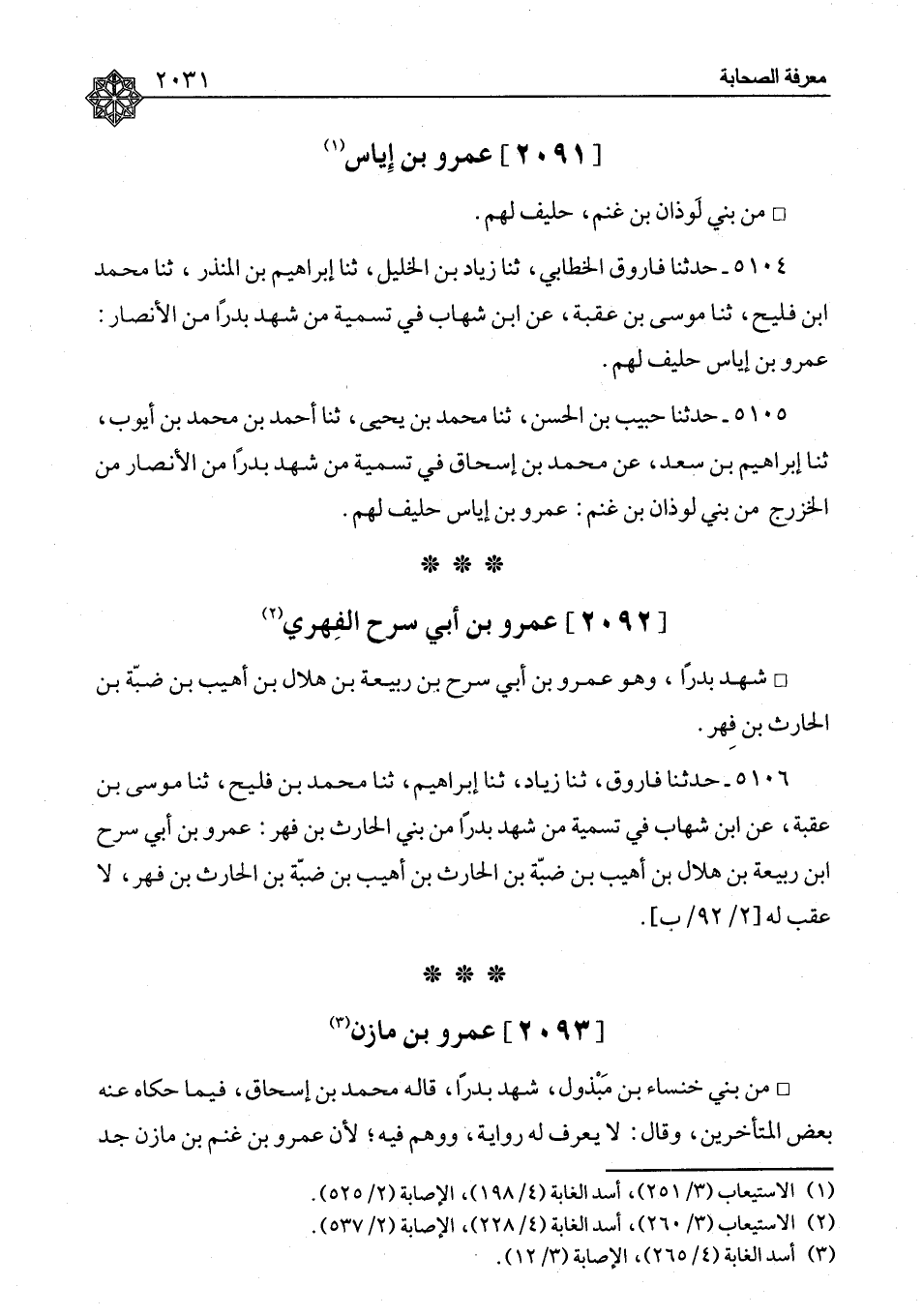 ٥١٠٤ - حَدَّثَنَا فَارُوقٌ الْخَطَّابِيُّ، ثنا زِيَادُ بْنُ الْخَلِيلِ، ثنا إِبْرَاهِيمُ بْنُ الْمُنْذِرِ، ثنا مُحَمَّدُ بْنُ فُلَيْحٍ، ثنا مُوسَى بْنُ عُقْبَةَ، عَنِ ابْنِ شِهَابٍ، " فِي تَسْمِيَةِ مَنْ شَهِدَ بَدْرًا مِنَ الْأَنْصَارِ: عَمْرُو بْنُ إِيَاسٍ حَلِيفٌ لَهُمْ "