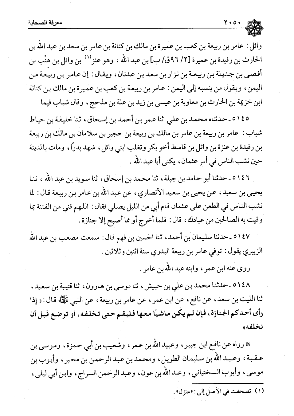 ٥١٤٧ - حَدَّثَنَا سُلَيْمَانُ بْنُ أَحْمَدَ، ثنا الْحُسَيْنُ بْنُ فِهْمٍ، قَالَ: سَمِعْتُ مُصْعَبَ بْنَ عَبْدِ اللهِ الزُّبَيْرِيَّ، يَقُولُ: «تُوُفِّيَ عَامِرُ بْنُ رَبِيعَةَ الْبَدْرِيٌّ سَنَةَ اثْنَيْنِ وَثَلَاثِينَ» رَوَى عَنْهُ ابْنُ عُمَرَ، وَابْنُهُ عَبْدُ اللهِ بْنُ عَامِرٍ