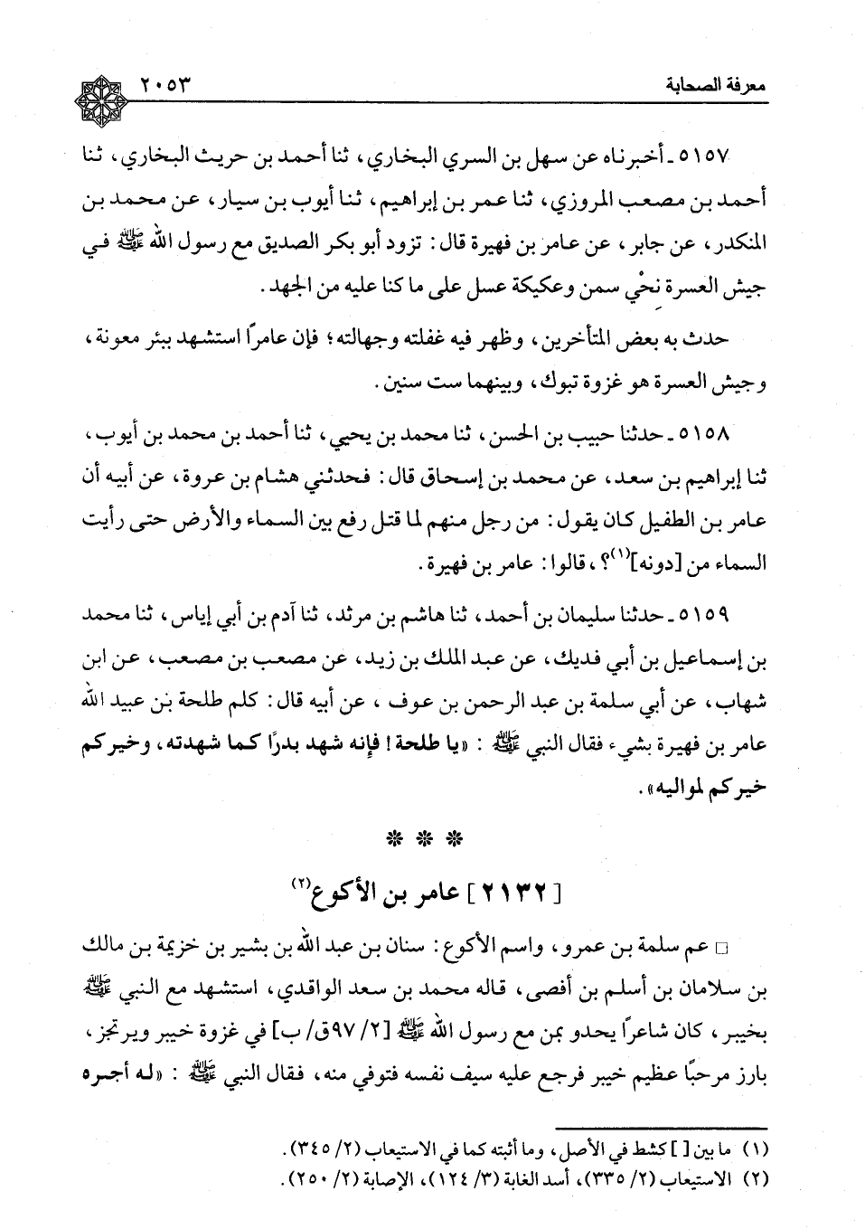 ٥١٥٧ - أَخْبَرَنَاهُ عَنْ سَهْلِ بْنِ السَّرِيِّ الْبُخَارِيِّ، ثنا أَحْمَدُ بْنُ حُرَيْثٍ الْبُخَارِيُّ، ثنا أَحْمَدُ بْنُ مُصْعَبٍ الْمَرْوَزِيُّ، ثنا عُمَرُ بْنُ إِبْرَاهِيمَ، ثنا أَيُّوبُ بْنُ سَيَّارٍ، عَنْ مُحَمَّدِ بْنِ الْمُنْكَدِرِ، عَنْ جَابِرٍ، عَنْ عَامِرِ بْنِ فُهَيْرَةَ، قَالَ: «تَزَوَّدَ أَبُو بَكْرٍ الصِّدِّيقُ مَعَ رَسُولِ اللهِ صَلَّى اللَّهُ عَلَيْهِ وَسَلَّمَ فِي جَيْشِ الْعُسْرَةِ نِحْيَ سَمْنٍ وَعُكَيْكَةَ عَسَلٍ عَلَى مَا كُنَّا عَلَيْهِ مِنَ الْجَهْدِ» حَدَّثَ بِهِ بَعْضُ الْمُتَأَخِّرِينَ، وَظَهَرَ فِيهِ غَفْلَتُهُ وَجَهَالَتُهُ، فَإِنَّ عَامِرًا اسْتُشْهِدَ بِبِئْرِ مَعُونَةَ، وَجَيْشُ الْعُسْرَةِ هُوَ غَزْوَةُ تَبُوكَ، وَبَيْنَهُمَا سِتُّ سِنِينَ