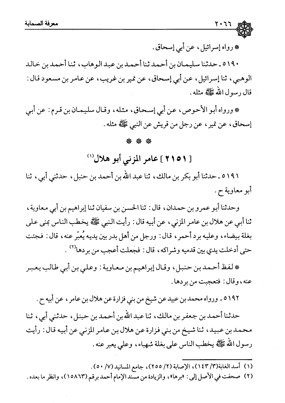 ٥١٩١ - حَدَّثَنَا أَبُو بَكْرِ بْنُ مَالِكٍ، ثنا عَبْدُ اللهِ بْنُ أَحْمَدَ بْنِ حَنْبَلٍ، حَدَّثَنِي أَبِي، ثنا أَبُو مُعَاوِيَةَ، ح وَحَدَّثَنَا أَبُو عَمْرِو بْنُ حَمْدَانَ، قَالَ: ثنا الْحَسَنُ بْنُ سُفْيَانَ، ثنا إِبْرَاهِيمُ بْنُ أَبِي مُعَاوِيَةَ، ثنا أَبِي، عَنْ هِلَالِ بْنِ عَامِرٍ الْمُزَنِيِّ، عَنْ أَبِيهِ، قَالَ: " رَأَيْتُ النَّبِيَّ صَلَّى اللَّهُ عَلَيْهِ وَسَلَّمَ يَخْطُبُ النَّاسَ بِمِنًى عَلَى بَغْلَةٍ بَيْضَاءَ، وَعَلَيْهِ بُرْدٌ أَحْمَرُ، قَالَ: وَرَجُلٌ مِنْ أَهْلِ بَدْرٍ بَيْنَ يَدَيْهِ يُعَبِّرُ عَنْهُ، قَالَ: فَجِئْتُ حَتَّى أَدْخَلْتُ يَدِي بَيْنَ قَدَمَيْهِ وَشِرَاكِهِ، قَالَ: فَجَعَلْتُ أَعْجَبُ مِنْ بَرْدِهَا " لَفْظُ أَحْمَدَ بْنِ حَنْبَلٍ، وَقَالَ إِبْرَاهِيمُ بْنُ مُعَاوِيَةَ: وَعَلِيُّ بْنُ أَبِي طَالِبٍ يُعَبِّرُ عَنْهُ، وَقَالَ: فَتَعَجَّبْتُ مِنْ بَرْدِهَا