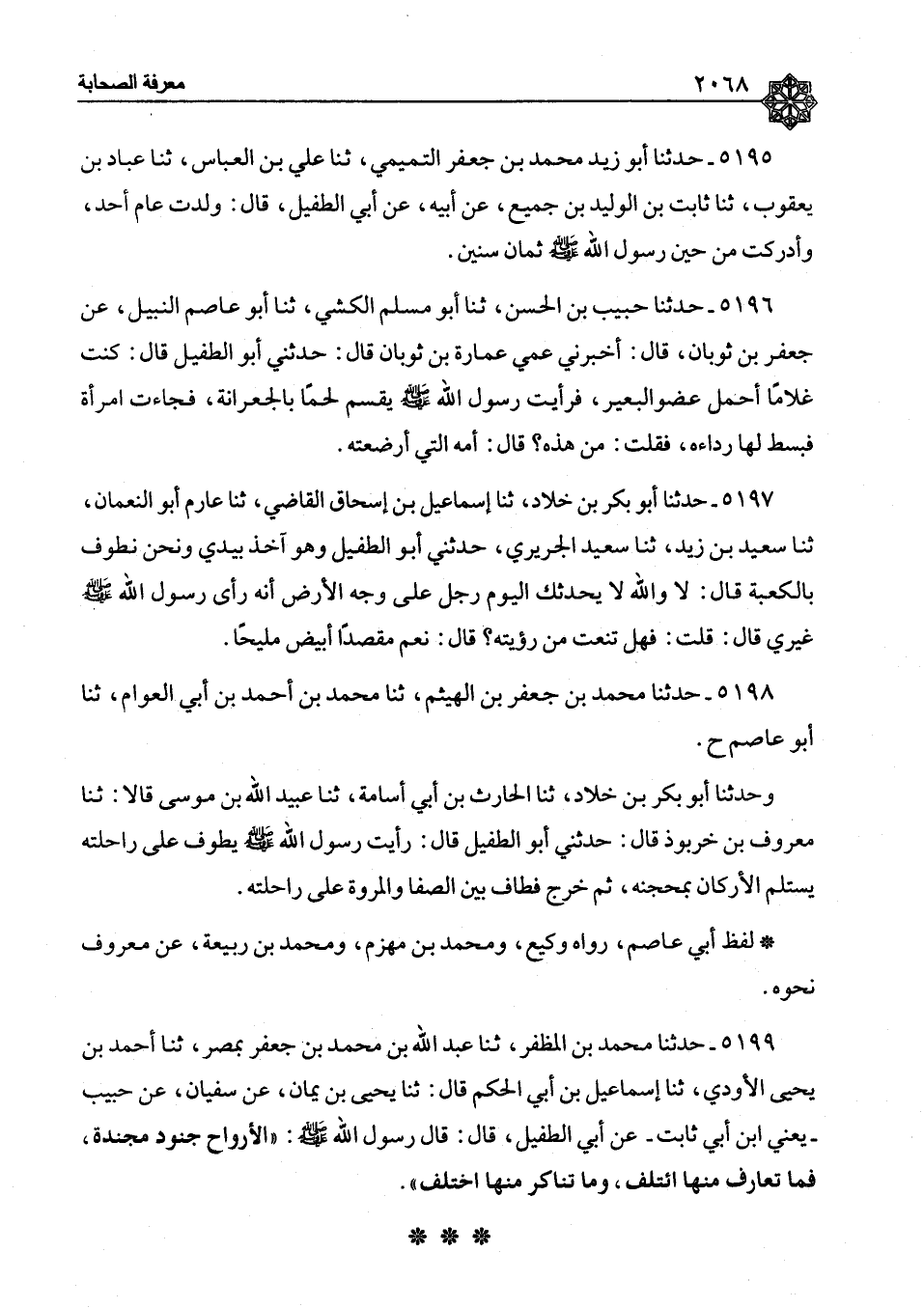 ٥١٩٧ - حَدَّثَنَا أَبُو بَكْرِ بْنُ خَلَّادٍ، ثنا إِسْمَاعِيلُ بْنُ إِسْحَاقَ الْقَاضِي، ثنا عَارِمُ أَبُو النُّعْمَانِ، ثنا سَعِيدُ بْنُ زَيْدٍ، ثنا سَعِيدٌ الْجُرَيْرِيُّ، حَدَّثَنِي أَبُو الطُّفَيْلِ، وَهُوَ آخِذٌ بِيَدِي وَنَحْنُ نَطُوفُ بِالْكَعْبَةِ، قَالَ: " لَا وَاللهِ، لَا يُحَدِّثُكَ الْيَوْمَ رَجُلٌ عَلَى وَجْهِ الْأَرْضِ أَنَّهُ رَأَى رَسُولَ اللهِ صَلَّى اللَّهُ عَلَيْهِ وَسَلَّمَ غَيْرِي، قَالَ: قُلْتُ: فَهَلْ تَنْعَتُ مِنْ رُؤْيَتِهِ؟ قَالَ: نَعَمْ، مُقَصَّدًا أَبْيَضَ مَلِيحًا "