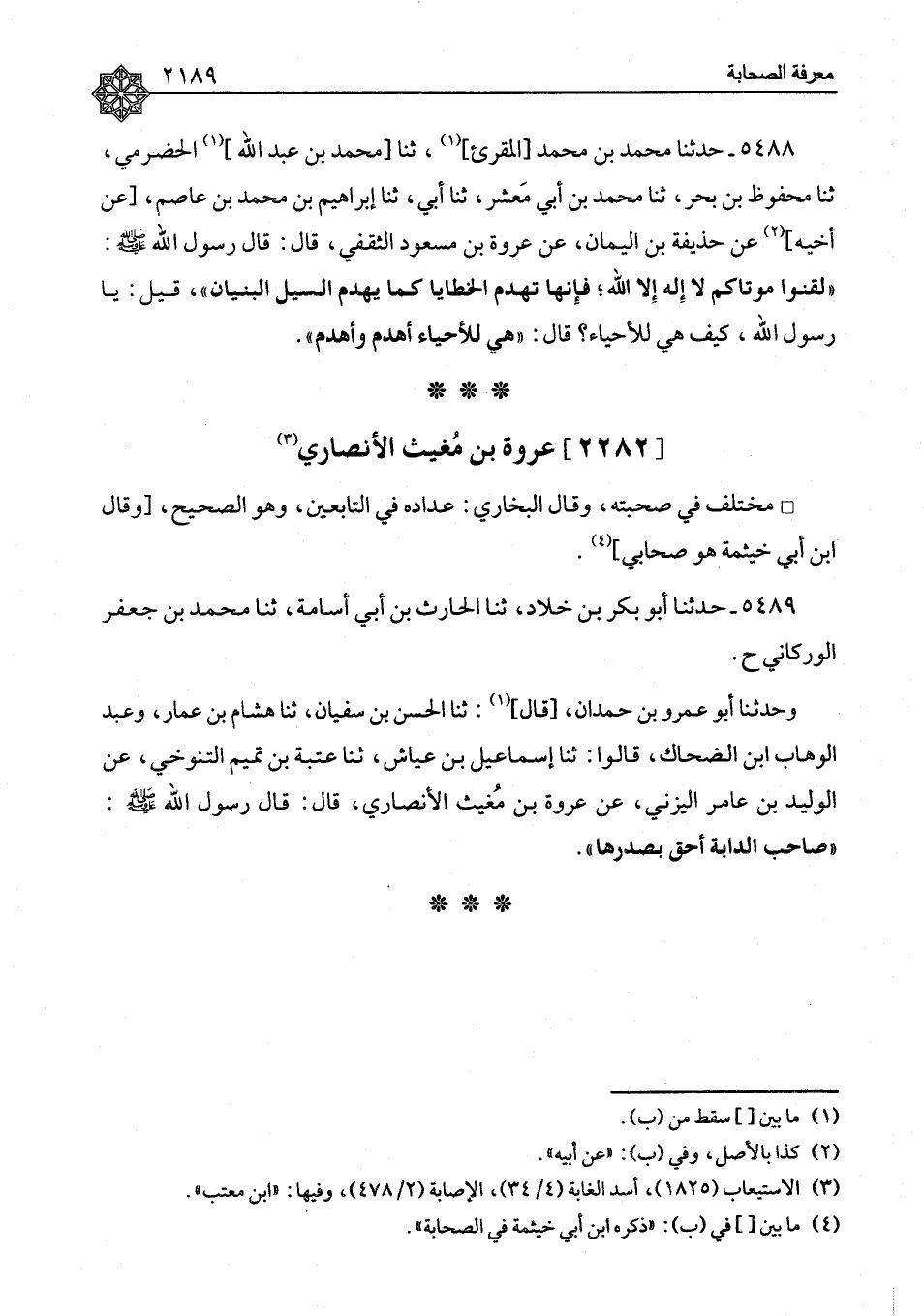 ٥٤٨٩ - حَدَّثَنَا أَبُو بَكْرِ بْنُ خَلَّادٍ، ثنا الْحَارِثُ بْنُ أَبِي أُسَامَةَ، ثنا مُحَمَّدُ بْنُ جَعْفَرٍ الْوَرَكَانِيُّ، ح، وَحَدَّثَنَا أَبُو عَمْرِو بْنُ حَمْدَانَ، قَالَ: ثنا الْحَسَنُ بْنُ سُفْيَانَ، ثنا هِشَامُ بْنُ عَمَّارٍ، وَعَبْدُ الْوَهَّابِ بْنُ الضَّحَّاكِ، قَالُوا: ثنا إِسْمَاعِيلُ بْنُ عَيَّاشٍ، ثنا عُتْبَةُ بْنُ تَمِيمٍ التَّنُوخِيُّ، عَنِ الْوَلِيدِ بْنِ عَامِرٍ الْيَزَنِيِّ، عَنْ عُرْوَةَ بْنِ مُغِيثٍ الْأَنْصَارِيِّ، قَالَ: قَالَ رَسُولُ اللهِ صَلَّى اللَّهُ عَلَيْهِ وَسَلَّمَ: «صَاحِبُ الدَّابَّةِ أَحَقُّ بِصَدْرِهَا»