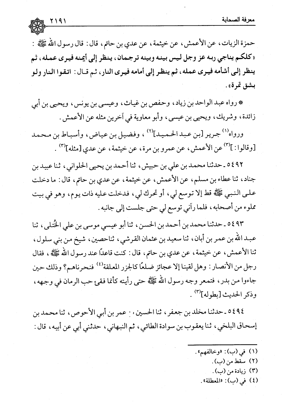 ٥٤٩٢ - حَدَّثَنَا مُحَمَّدُ بْنُ عَلِيِّ بْنِ حُبَيْشٍ، ثنا أَحْمَدُ بْنُ يَحْيَى الْحُلْوَانِيُّ، ثنا عُبَيْدُ بْنُ جُنَادٍ، ثنا عَطَاءُ بْنُ مُسْلِمٍ، عَنِ الْأَعْمَشِ، عَنْ خَيْثَمَةَ، عَنْ عَدِيِّ بْنِ حَاتِمٍ، قَالَ: «مَا دَخَلْتُ عَلَى النَّبِيِّ صَلَّى اللَّهُ عَلَيْهِ وَسَلَّمَ قَطُّ إِلَّا تَوَسَّعَ لِي، أَوْ تَحَرَّكَ لِي، فَدَخَلْتُ عَلَيْهِ ذَاتَ يَوْمٍ، وَهُوَ فِي بَيْتٍ مَمْلُوءٍ مِنْ أَصْحَابِهِ، فَلَمَّا رَآنِي تَوَسَّعَ لِي حَتَّى جَلَسْتُ إِلَى جَانِبِهِ»