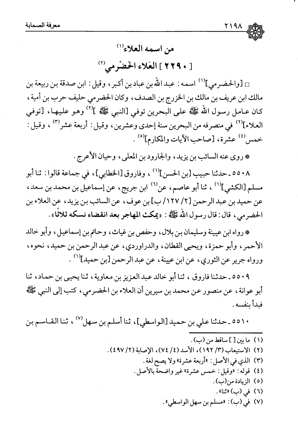 ٥٥٠٩ - حَدَّثَنَا فَارُوقٌ، ثنا أَبُو خَالِدٍ عَبْدُ الْعَزِيزِ بْنُ مُعَاوِيَةَ، ثنا يَحْيَى بْنُ حَمَّادٍ، ثنا أَبُو عَوَانَةَ، عَنْ مَنْصُورٍ، عَنْ مُحَمَّدِ بْنِ سِيرِينَ، أَنَّ الْعَلَاءَ بْنَ الْحَضْرَمِيِّ، «كَتَبَ إِلَى النَّبِيِّ صَلَّى اللَّهُ عَلَيْهِ وَسَلَّمَ فَبَدَأَ بِنَفْسِهِ»