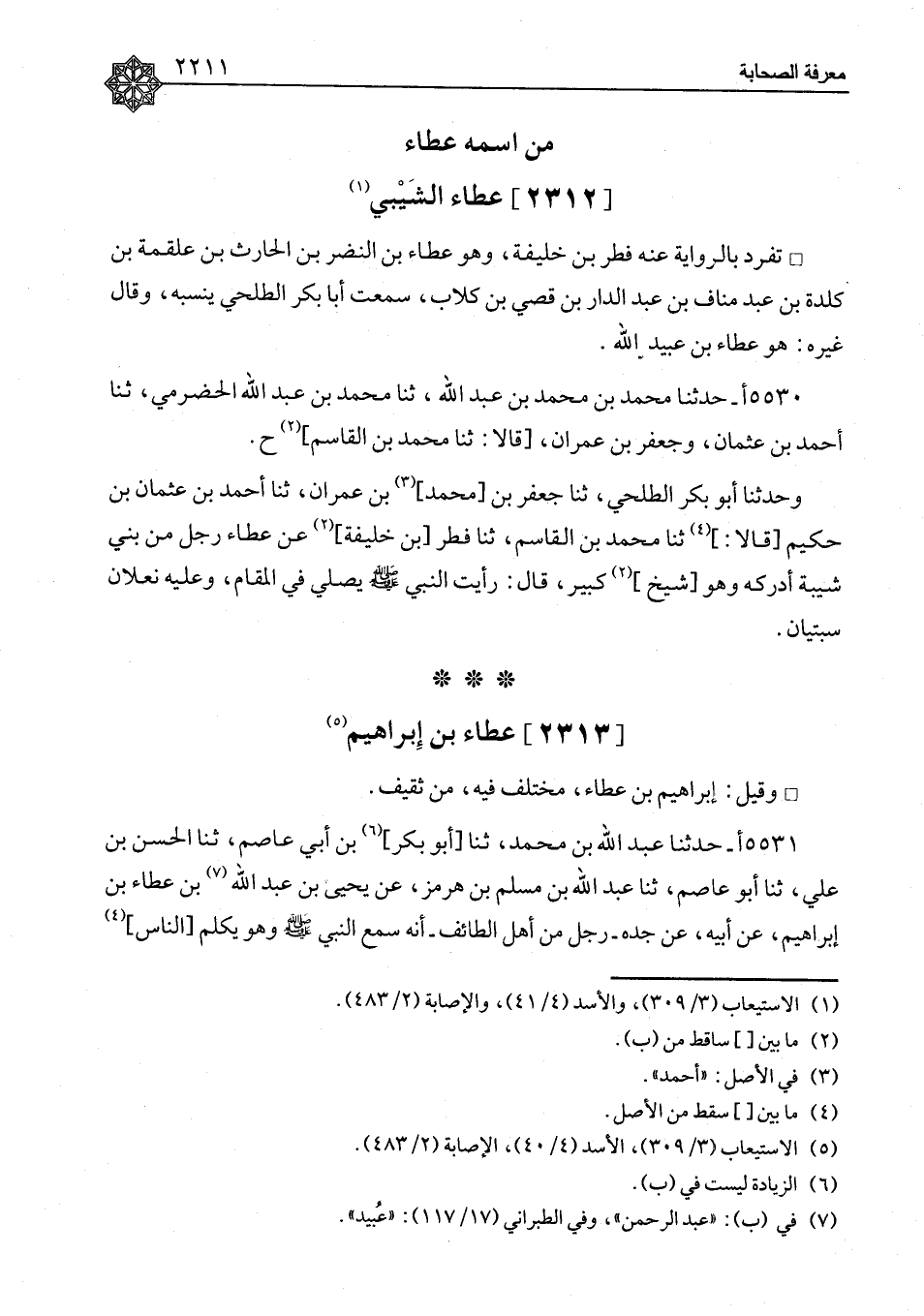 ٥٥٣٠ - حَدَّثَنَا مُحَمَّدُ بْنُ مُحَمَّدِ بْنِ عَبْدِ اللهِ، ثنا مُحَمَّدُ بْنُ عَبْدِ اللهِ الْحَضْرَمِيُّ، ثنا أَحْمَدُ بْنُ عُثْمَانَ، وَجَعْفَرُ بْنُ عِمْرَانَ، قَالَا: ثنا مُحَمَّدُ بْنُ الْقَاسِمِ، ح، وَحَدَّثَنَا أَبُو بَكْرٍ الطَّلْحِيُّ، ثنا جَعْفَرُ بْنُ مُحَمَّدِ بْنِ عِمْرَانَ، ثنا أَحْمَدُ بْنُ عُثْمَانَ بْنِ حَكِيمٍ، قَالَا: ثنا مُحَمَّدُ بْنُ الْقَاسِمِ، ثنا فِطْرُ بْنُ خَلِيفَةَ، عَنْ عَطَاءٍ، رَجُلٌ مِنْ بَنِي شَيْبَةَ أَدْرَكَهُ وَهُوَ شَيْخٌ كَبِيرٌ، قَالَ: «رَأَيْتُ النَّبِيَّ صَلَّى اللَّهُ عَلَيْهِ وَسَلَّمَ يُصَلِّي فِي الْمَقَامِ، وَعَلَيْهِ نَعْلَانِ سِبْتِيَّانِ»