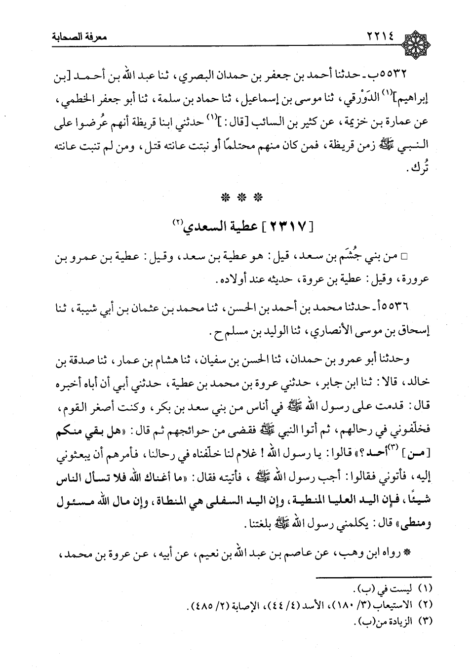 ٥٥٣٦ - حَدَّثَنَا مُحَمَّدُ بْنُ أَحْمَدَ بْنِ الْحَسَنِ، ثنا مُحَمَّدُ بْنُ عُثْمَانَ بْنِ أَبِي شَيْبَةَ، ثنا إِسْحَاقُ بْنُ مُوسَى الْأَنْصَارِيُّ، ثنا الْوَلِيدُ بْنُ مُسْلِمٍ، ح وَحَدَّثَنَا أَبُو عَمْرِو بْنُ حَمْدَانَ، ثنا الْحَسَنُ بْنُ سُفْيَانَ، ثنا هِشَامُ بْنُ عَمَّارٍ، ثنا صَدَقَةُ بْنُ خَالِدٍ، قَالَا: ثنا ابْنُ جَابِرٍ، حَدَّثَنِي عُرْوَةُ بْنُ مُحَمَّدِ بْنِ عَطِيَّةَ، حَدَّثَنِي أَبِي أَنَّ أَبَاهُ أَخْبَرَهُ قَالَ: قَدِمْتُ عَلَى رَسُولِ اللهِ صَلَّى اللَّهُ عَلَيْهِ وَسَلَّمَ فِي أُنَاسٍ مِنْ بَنِي سَعْدِ بْنِ بَكْرٍ، وَكُنْتُ أَصْغَرَ الْقَوْمِ، فَخَلَّفُونِي فِي رِحَالِهِمْ، ثُمَّ أَتَوَا النَّبِيَّ صَلَّى اللَّهُ عَلَيْهِ وَسَلَّمَ فَقَضَى مِنْ حَوَائِجِهِمْ، ثُمَّ قَالَ: «هَلْ بَقِيَ مِنْكُمْ مِنْ أَحَدٍ؟» ، قَالُوا: يَا رَسُولَ اللهِ، غُلَامٌ لَنَا خَلَّفْنَاهُ فِي رِحَالِنَا، فَأَمَرَهُمْ أَنْ يَبْعَثُونِي إِلَيْهِ، فَأَتَوْنِي، فَقَالُوا: أَجِبْ رَسُولَ اللهِ صَلَّى اللَّهُ عَلَيْهِ وَسَلَّمَ، فَأَتَيْتُهُ، فَقَالَ: «مَا أَغْنَاكَ اللهُ فَلَا تَسْأَلِ النَّاسَ شَيْئًا، فَإِنَّ الْيَدَ الْعُلْيَا الْمُنْطِيَةُ، وَإِنَّ الْيَدَ السُّفْلَى هِيَ الْمُنْطَاةُ، وَإِنَّ مَالَ اللهِ مَسْئُولٌ وَمُنْطًى» ، قَالَ: يُكَلِّمُنِي رَسُولُ اللهِ صَلَّى اللَّهُ عَلَيْهِ وَسَلَّمَ بِلُغَتِنَا رَوَاهُ ابْنُ وَهْبٍ، عَنْ عَاصِمِ بْنِ عَبْدِ اللهِ بْنِ نُعَيْمٍ، عَنْ أَبِيهِ، عَنْ عُرْوَةَ بْنِ مُحَمَّدٍ، ⦗٢٢١٥⦘ وَعَنْ حَمَّادِ بْنِ سَلَمَةَ، عَنْ رَجَاء أَبِي الْمِقْدَامِ، عَنْ إِسْمَاعِيلَ بْنِ عُبَيْدِ اللهِ، عَنْ عَطِيَّةَ، نَحْوَهُ وَرَوَاهُ مَعْمَرٌ، عَنْ سِمَاكِ بْنِ الْفَضْلِ، عَنْ عُرْوَةَ، مُخْتَصَرًا وَرَوَاهُ ضِرَارُ بْنُ صُرَدٍ، عَنْ سَعِيدِ بْنِ عَبْدِ الْجَبَّارِ، عَنْ مَنْصُورِ بْنِ رَجَاءٍ، عَنْ إِسْمَاعِيلَ بْنِ عُبَيْدِ اللهِ، عَنْ عَطِيَّةَ بْنِ عَمْرٍو السَّعْدِيِّ، عَنْ أَبِيهِ، عَنِ النَّبِيِّ صَلَّى اللَّهُ عَلَيْهِ وَسَلَّمَ مُخْتَصَرًا