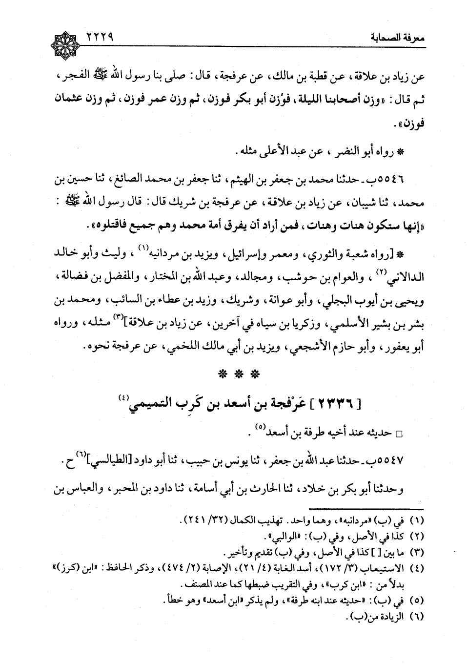 ٥٥٤٦ - حَدَّثَنَا مُحَمَّدُ بْنُ جَعْفَرِ بْنِ الْهَيْثَمِ، ثنا جَعْفَرُ بْنُ مُحَمَّدٍ الصَّائِغُ، ثنا حُسَيْنُ بْنُ مُحَمَّدٍ، ثنا شَيْبَانُ، عَنْ زِيَادِ بْنِ عِلَاقَةَ، عَنْ عَرْفَجَةَ بْنِ شَرِيكٍ، قَالَ: قَالَ رَسُولُ اللهِ صَلَّى اللَّهُ عَلَيْهِ وَسَلَّمَ: «إِنَّهَا سَتَكُونُ هَنَاتٌ وَهَنَاتٌ، فَمَنْ أَرَادَ أَنْ يُفَرِّقَ أُمَّةَ مُحَمَّدٍ وَهُمْ جَمِيعٌ فَاقْتُلُوهُ» رَوَاهُ شُعْبَةُ، وَالثَّوْرِيُّ، وَمَعْمَرٌ، وَإِسْرَائِيلُ، وَيَزِيدُ بْنُ مَرْدَانَيْهِ، وَلَيْثٌ، وَأَبُو خَالِدٍ الدَّالَانِيُّ، وَالْعَوَّامُ بْنُ حَوْشَبٍ، وَمُجَالِدٌ، وَعَبْدُ اللهِ بْنُ الْمُخْتَارِ، وَالْمُفَضَّلُ بْنُ فَضَالَةَ، وَيَحْيَى بْنُ أَيُّوبَ الْبَجَلِيُّ، وَأَبُو عَوَانَةَ، وَشَرِيكٌ، وَزَيْدُ بْنُ عَطَاءِ بْنِ السَّائِبِ، وَمُحَمَّدُ بْنُ بِشْرِ بْنِ بَشِيرٍ الْأَسْلَمِيُّ، وَزَكَرِيَّا بْنُ سِيَاهٍ فِي آخَرِينَ، عَنْ زِيَادِ بْنِ عِلَاقَةَ، مِثْلَهُ وَرَوَاهُ أَبُو يَعْفُورَ، وَأَبُو حَازِمٍ الْأَشْجَعِيُّ، وَيَزِيدُ بْنُ أَبِي مَالِكٍ اللَّخْمِيُّ، عَنْ عَرْفَجَةَ نَحْوَهُ