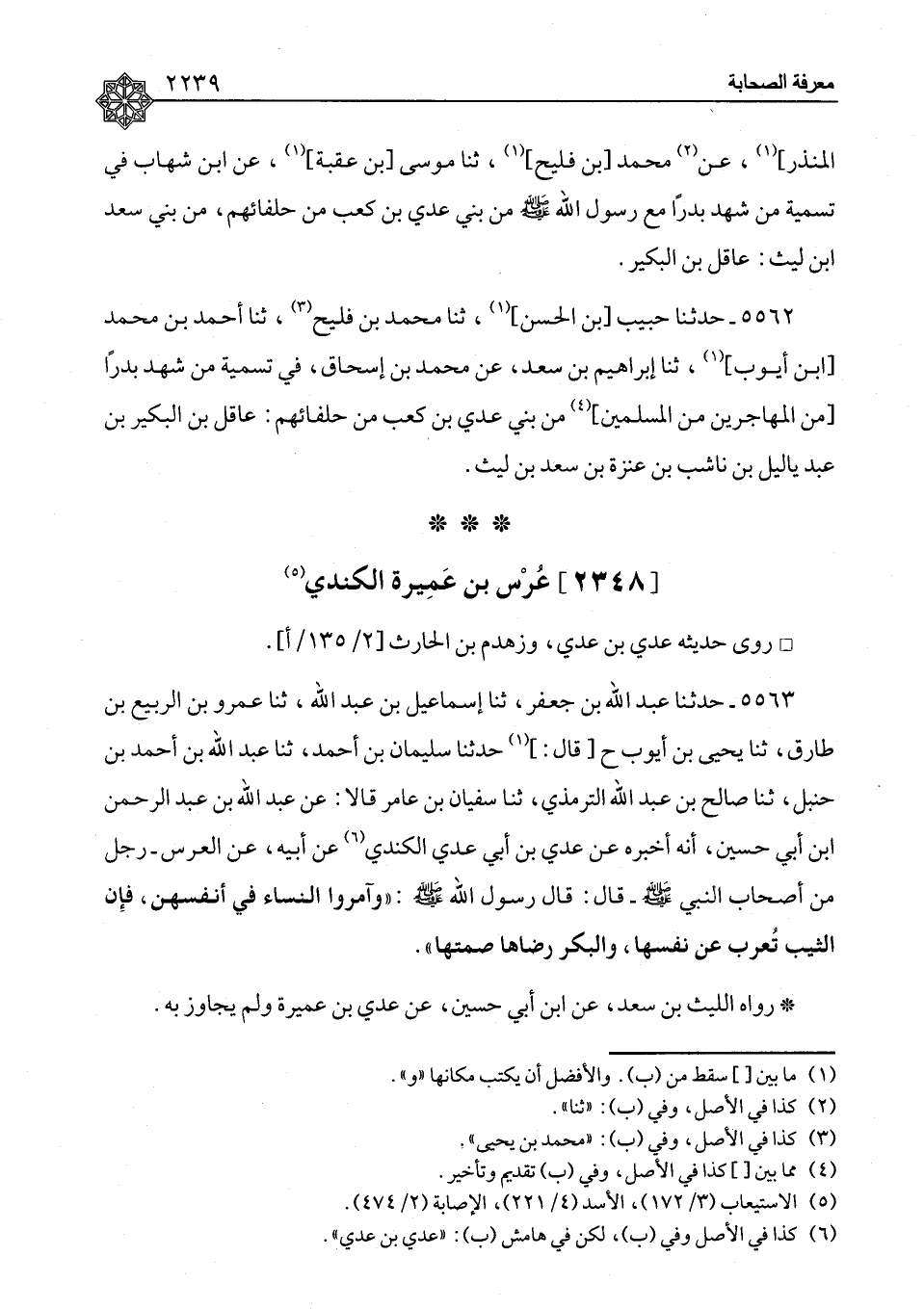 ٥٥٦٢ - حَدَّثَنَا حَبِيبُ بْنُ الْحَسَنِ، ثنا مُحَمَّدُ بْنُ فُلَيْحٍ، ثنا أَحْمَدُ بْنُ مُحَمَّدِ بْنِ أَيُّوبَ، ثنا إِبْرَاهِيمُ بْنُ سَعْدٍ، عَنْ مُحَمَّدِ بْنِ إِسْحَاقَ، " فِي تَسْمِيَةِ مَنْ شَهِدَ بَدْرًا مِنَ الْمُهَاجِرِينَ مِنَ الْمُسْلِمِينَ، مِنْ بَنِي عَدِيِّ بْنِ كَعْبٍ مِنْ حُلَفَائِهِمْ: عَاقِلُ بْنُ الْبُكَيْرِ بْنِ عَبْدِ يَالِيلَ بْنِ نَاشِبِ بْنِ عَنَزَةَ بْنِ سَعْدِ بْنِ لَيْثٍ "