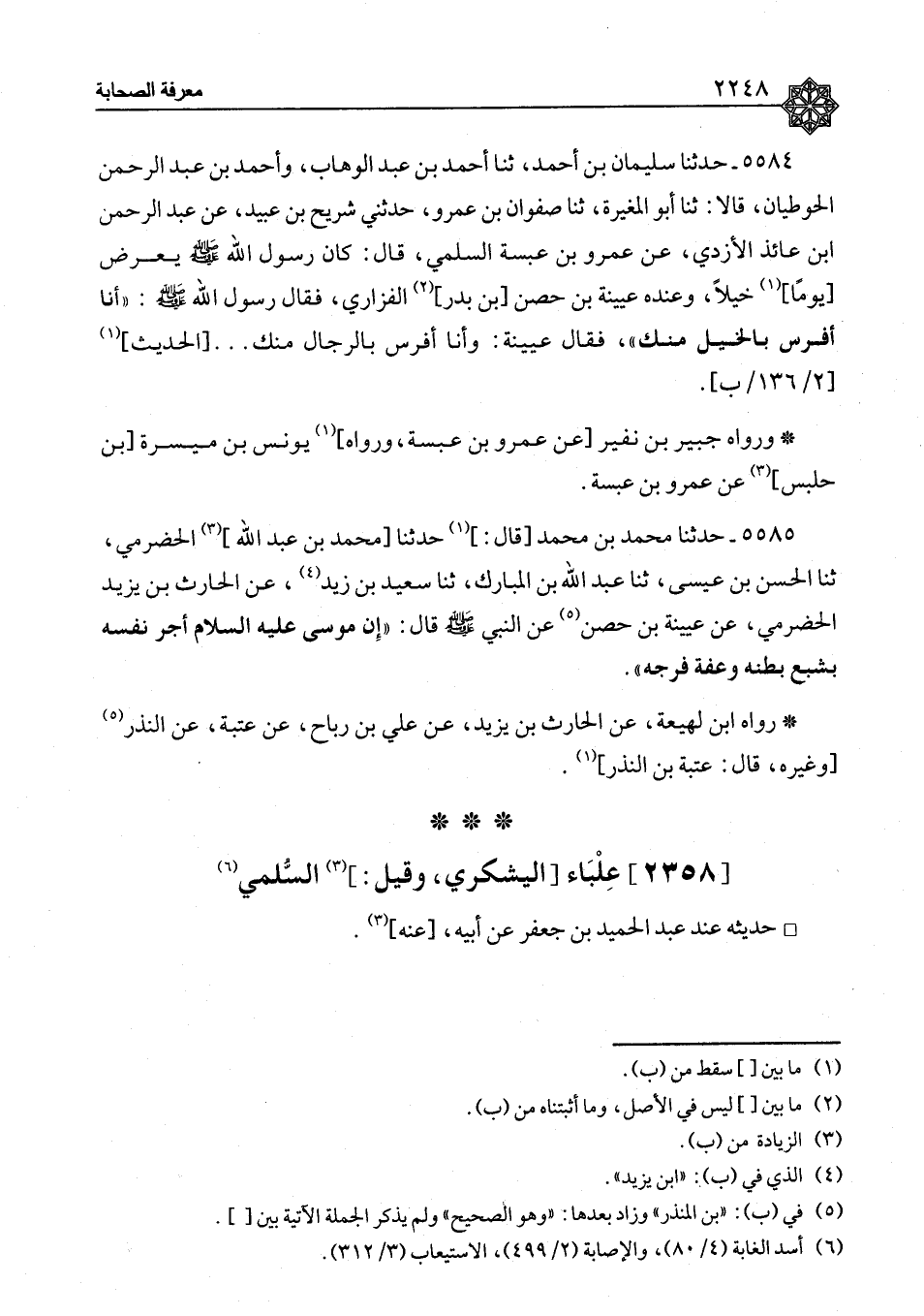 ٥٥٨٤ - حَدَّثَنَا سُلَيْمَانُ بْنُ أَحْمَدَ، ثنا أَحْمَدُ بْنُ عَبْدِ الْوَهَّابِ، وَأَحْمَدُ بْنُ عَبْدِ الرَّحْمَنِ الْحُوطِيَّانِ، قَالَا: ثنا أَبُو الْمُغِيرَةِ، ثنا صَفْوَانُ بْنُ عَمْرٍو، حَدَّثَنِي شُرَيْحُ بْنُ عُبَيْدٍ، عَنْ عَبْدِ الرَّحْمَنِ بْنِ عَائِذٍ الْأَزْدِيِّ، عَنْ عَمْرِو بْنِ عَبْسَةَ السُّلَمِيِّ، قَالَ: كَانَ رَسُولُ اللهِ صَلَّى اللَّهُ عَلَيْهِ وَسَلَّمَ يَعْرِضُ يَوْمًا خَيْلًا، وَعِنْدَهُ عُيَيْنَةُ بْنُ حِصْنِ بْنِ بَدْرٍ الْفَزَارِيُّ، فَقَالَ رَسُولُ اللهِ صَلَّى اللَّهُ عَلَيْهِ وَسَلَّمَ: «أَنَا أَفْرَسُ بِالْخَيْلِ مِنْكَ» ، فَقَالَ عُيَيْنَةُ: وَأَنَا أَفْرَسُ بِالرِّجَالِ مِنْكَ. . الْحَدِيثَ وَرَوَاهُ جُبَيْرُ بْنُ نُفَيْرٍ، عَنْ عَمْرِو بْنِ عبْسَةَ وَرَوَاهُ يُونُسُ بْنُ مَيْسَرَةَ بْنِ حَلْبَسٍ، عَنْ عُمَرِو بْنِ عَبْسَةَ