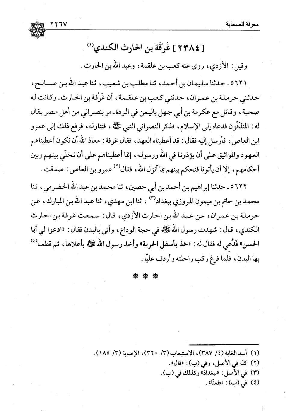 ٥٦٢٢ - حَدَّثَنَا إِبْرَاهِيمُ بْنُ أَحْمَدَ بْنِ أَبِي حُصَيْنٍ، ثنا مُحَمَّدُ بْنُ عَبْدِ اللهِ الْحَضْرَمِيُّ، ثنا مُحَمَّدُ بْنُ حَاتِمِ بْنِ مَيْمُونٍ الْمَرْوَزِيُّ، بِبَغْدَادَ، ثنا ابْنِ مَهْدِيٍّ، ثنا عَبْدُ اللهِ بْنُ الْمُبَارَكِ، عَنْ حَرْمَلَةَ بْنِ عِمْرَانَ، عَنْ عَبْدِ اللهِ بْنِ الْحَارِثِ الْأَزْدِيِّ، قَالَ: سَمِعْتُ غَرْفَةَ بْنَ الْحَارِثِ الْكِنْدِيَّ، قَالَ: شَهِدْتُ رَسُولَ اللهِ صَلَّى اللَّهُ عَلَيْهِ وَسَلَّمَ فِي حَجَّةِ الْوَدَاعِ، وَأَتَى بِالْبُدْنِ، فَقَالَ: «ادْعُوا لِي أَبَا الْحَسَنِ» ، فَدُعِيَ لَهُ، فَقَالَ لَهُ: «خُذْ بِأَسْفَلِ الْحَرْبَةِ» ، وَأَخَذَ رَسُولُ اللهِ صَلَّى اللَّهُ عَلَيْهِ وَسَلَّمَ بِأَعْلَاهَا، ثُمَّ قَطَعْنَا بِهَا الْبُدْنَ، فَلَمَّا فَرَغَ رَكِبَ رَاحِلَتَهُ وَأَرْدَفَ عَلِيًّا